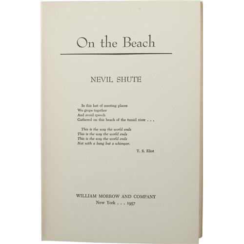 <B>Nevil Shute: <I>On the Beach</B></I>.</B></I> (New York: William Morrow, 1957), 320 pages, 8vo (5.75" x 8.25"), first edition. A classic post-apocalyptic novel and the basis for the excellent Stanley Kramer film starring Gregory Peck, Ava Gardner, Anthony Perkins, and Fred Astaire in his first dramatic role. The dust jacket is slightly worn with minor chipping at the top and bottom of the spine. The book is in very good condition. <BR><BR><b>Shipping:</b> Books & Catalogs (<a target="_blank" href="http://www.heritageauctions.com/common/shipping.php">view shipping information</a>)