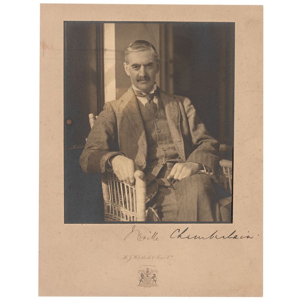 Vintage matte-finish 6.25 x 7.5 photo of Chamberlain seated in a wicker chair by H. J. Whitlock & Sons, photographers to the King, affixed to its original 8.5 x 11 mount, neatly signed on the mount in ink, "Neville Chamberlain." In very good to fine condition, with light silvering to the darker areas of the image, and some scattered stains.