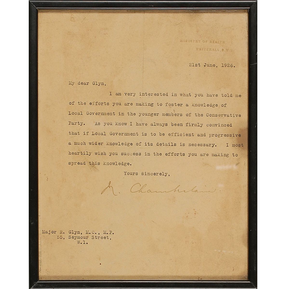 Prime Minister of Great Britain from 1937 to 1940. TLS signed “N. Chamberlain,” one page, 7.25 x 9.25, Ministry of Health letterhead, June 21, 1926. Letter to a soldier interested in politics. In full: “I am very interested in what you have told me of the efforts you are making to foster a knowledge of Local Government in the younger members of the Conservative Party. As you know I have always been firmly convinced that if Local Government is to be efficient and progressive a much wider knowledge of its details is necessary. I most heartily wish you success in the efforts you are making to spread this knowledge.” Framed to an overall size of 8 x 10. Central horizontal and vertical fold, with vertical fold passing through a single letter of signature, staple hole to lower right, uniform moderate toning, and scattered soiling, otherwise very good condition.