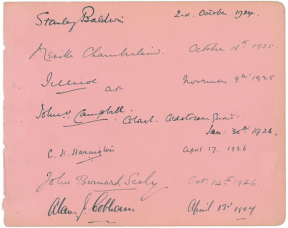 Vintage fountain pen signature, “Neville Chamberlain, October 16th, 1925,” on a light pink 8.75 x 7 album page, also signed by Stanley Baldwin, Alan J. Cobham, John V. Campbell, Charles Harington, and John Bernard Seely. In fine condition.