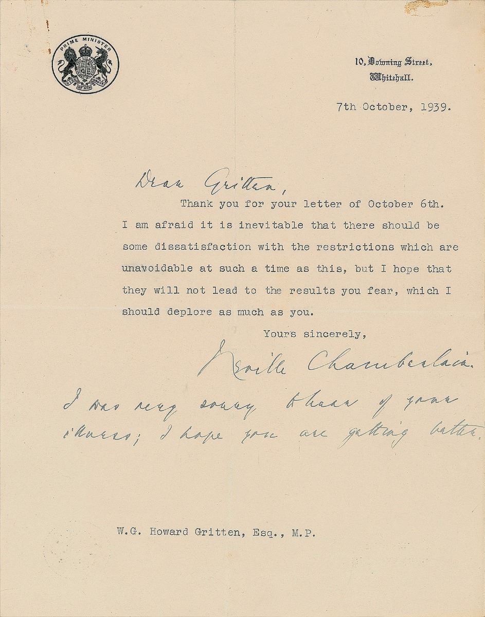 TLS, one page, 7.5 x 9.5, Prime Minister letterhead, October 7, 1939. Letter to W. G. Howard Gritten, in full: “Thank you for your letter of October 6th. I am afraid it is inevitable that there should be some dissatisfaction with the restrictions which are unavoidable at such a time as this, but I hope that they will not lead to the results you fear, which I should deplore as much as you.” Chamberlain handwrites the salutation, “Dear Gritten,” and adds a postscript to the conclusion, “I was very sorry to hear of your illness; I hope you are getting better.” In fine condition, with a rusty paperclip impression to the top edge. Accompanied by the original mailing envelope.