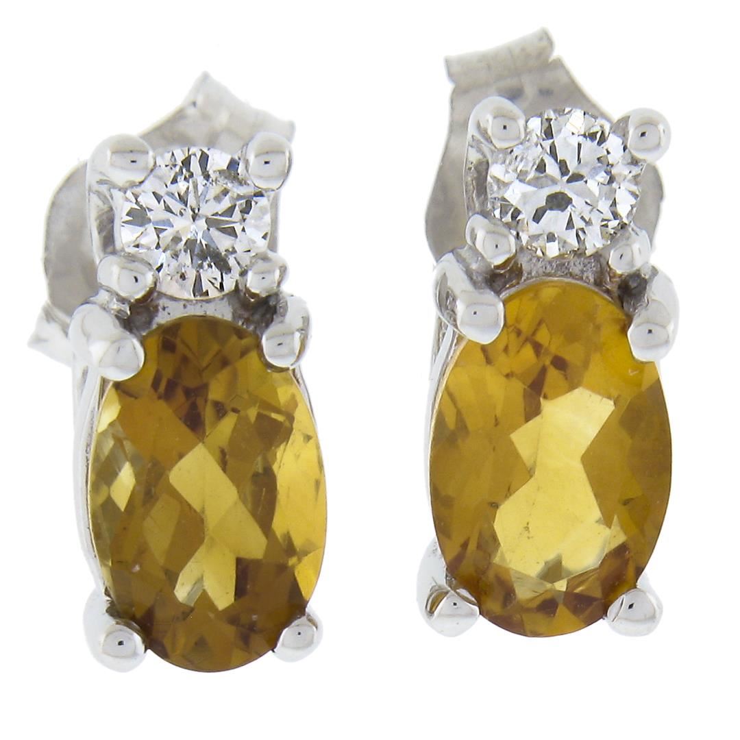 New 10K White Gold 1 ctw Prong Set Oval Citrine & Diamonds Stud Earrings