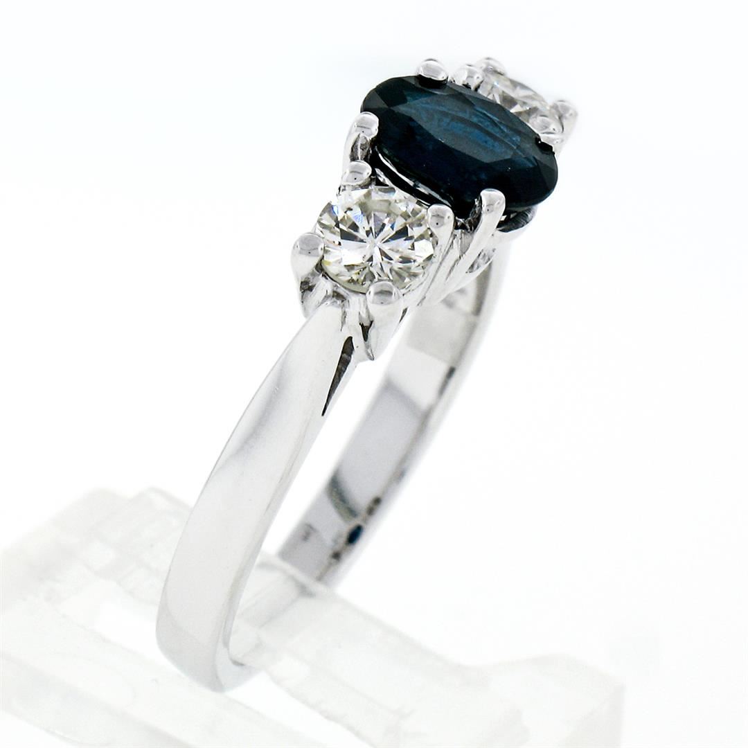 A new solid 14k white gold 3 stones ring, with 1 oval cut natural sapphire (7.0x5.30mm - 1.03ct), and 2 round brilliant cut natural diamonds (F/G- VS2 ; 0.50ctw ). The ring is size 6.5, weighs a total of 3.86 grams, and measures 7.0mm wide.