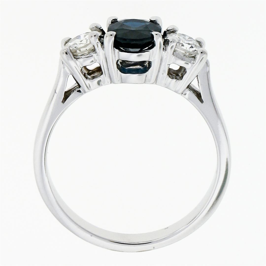 A new solid 14k white gold 3 stones ring, with 1 oval cut natural sapphire (7.0x5.30mm - 1.03ct), and 2 round brilliant cut natural diamonds (F/G- VS2 ; 0.50ctw ). The ring is size 6.5, weighs a total of 3.86 grams, and measures 7.0mm wide.