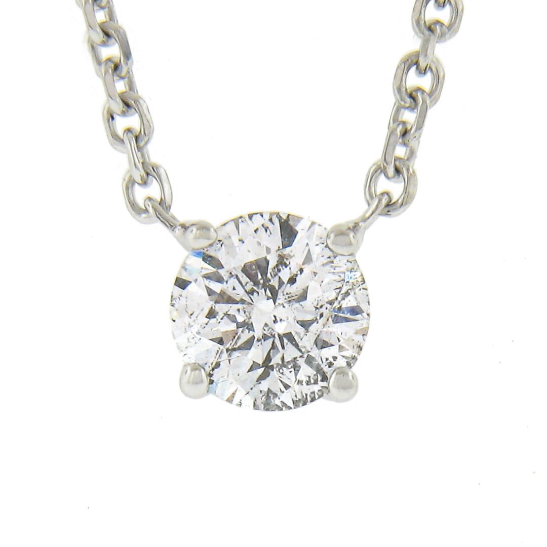 A new solid 14k white gold solitaire pendant necklace, with 1 round cut natural diamond (G - I2 ; 0.38ct). Adjustable at 16 or 18 inch cable link chain, 2.38 grams total weight, pendant measures 4.6mm.