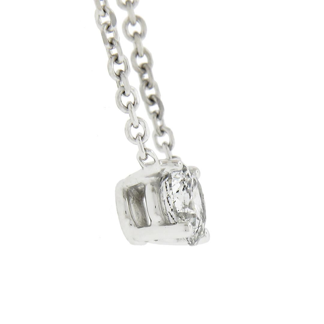 A new solid 14k white gold solitaire pendant necklace, with 1 round cut natural diamond (G - I2 ; 0.38ct). Adjustable at 16 or 18 inch cable link chain, 2.38 grams total weight, pendant measures 4.6mm.
