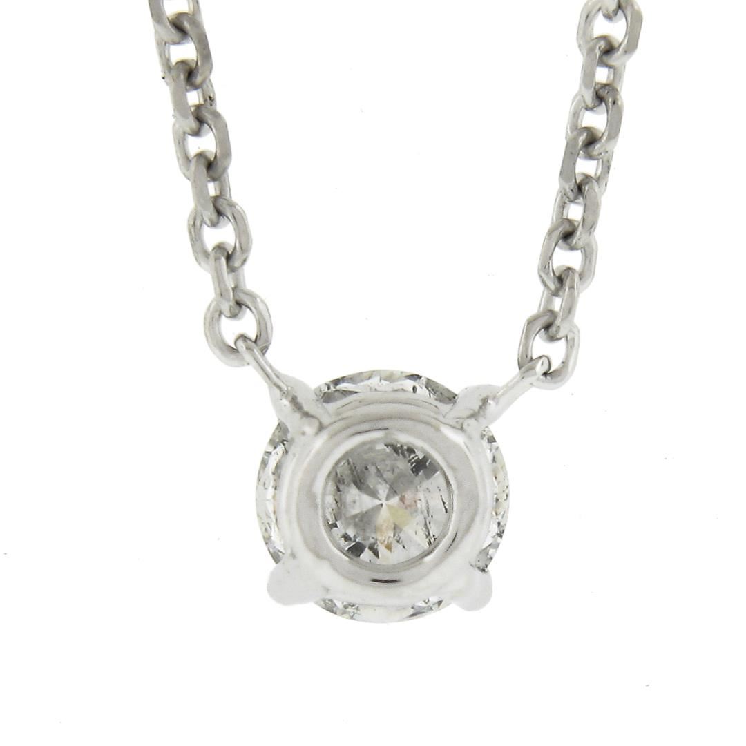 A new solid 14k white gold solitaire pendant necklace, with 1 round cut natural diamond (G - I2 ; 0.38ct). Adjustable at 16 or 18 inch cable link chain, 2.38 grams total weight, pendant measures 4.6mm.