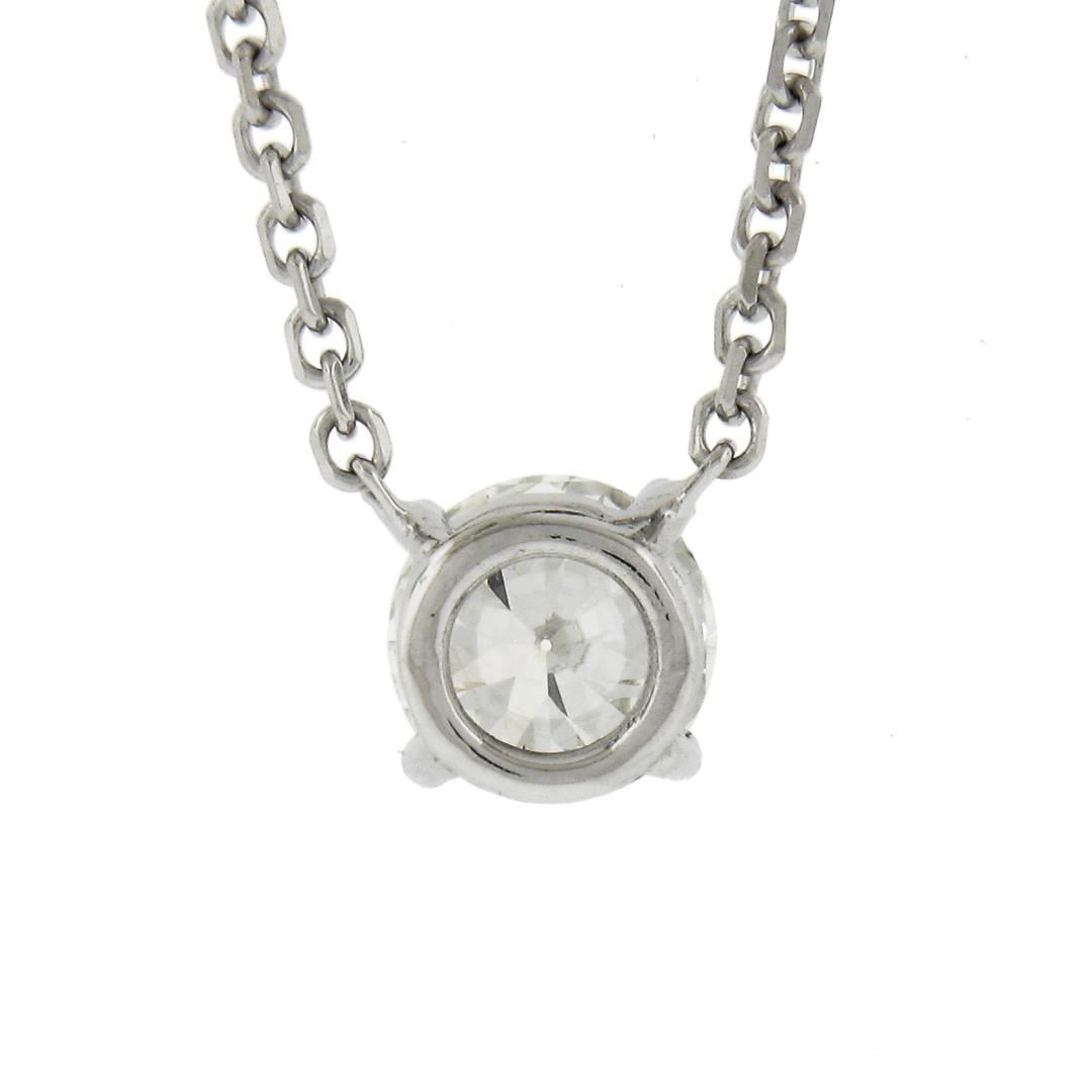 A new solid 14k white gold solitaire pendant necklace, with 1 round cut natural diamond (i, VS2 ; 0.42ct). Adjustable 16 or 18 inch cable link chain, 2.32 grams total weight, pendant measures 5.1mm in diameter.