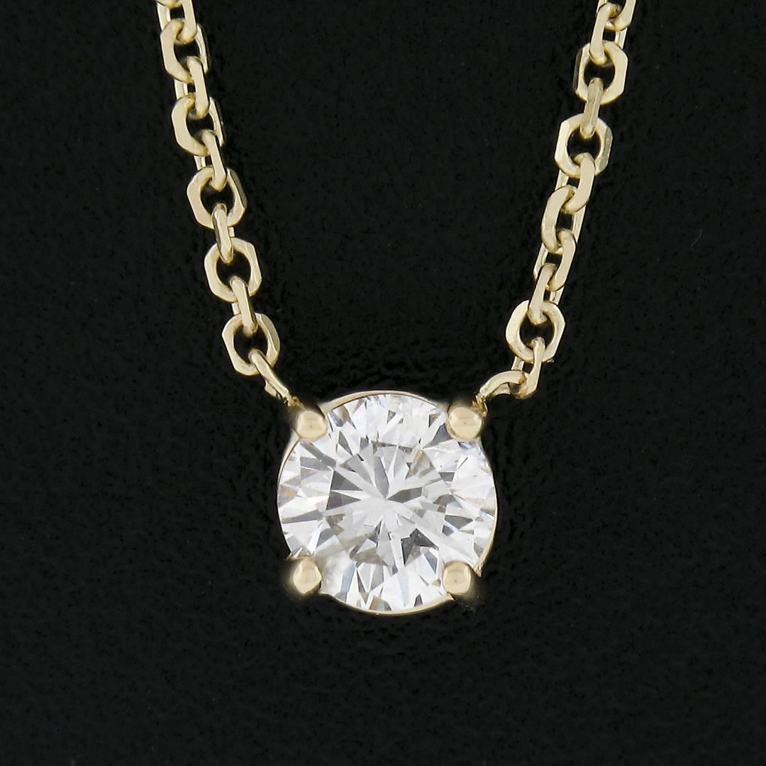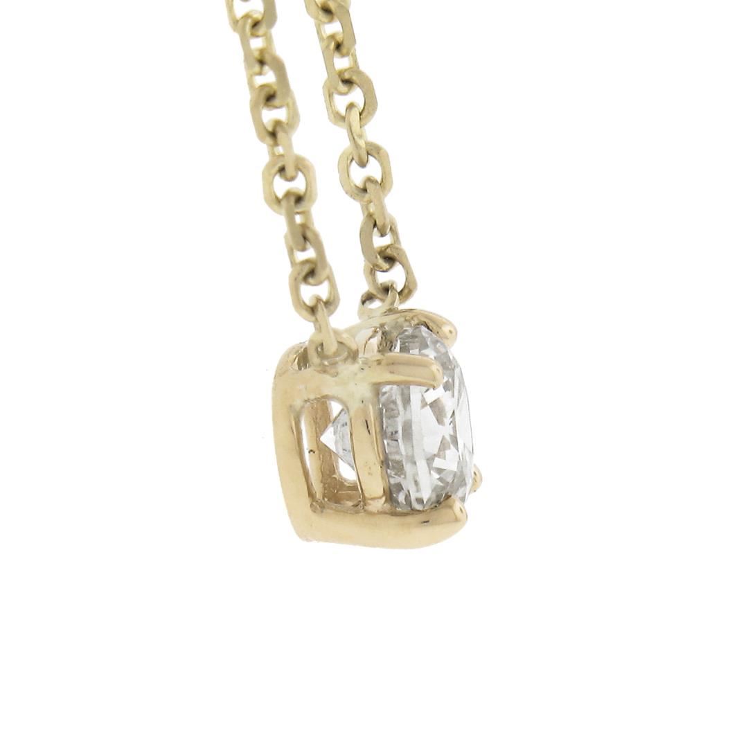 A new solid 14k yellow gold solitaire pendant necklace, with 1 round cut natural diamond (J - I1 ; 0.49ct). Adjustable 16 or 18 inch cable link chain, 2.32 grams total weight, pendant measures 5.9mm in diameter.
