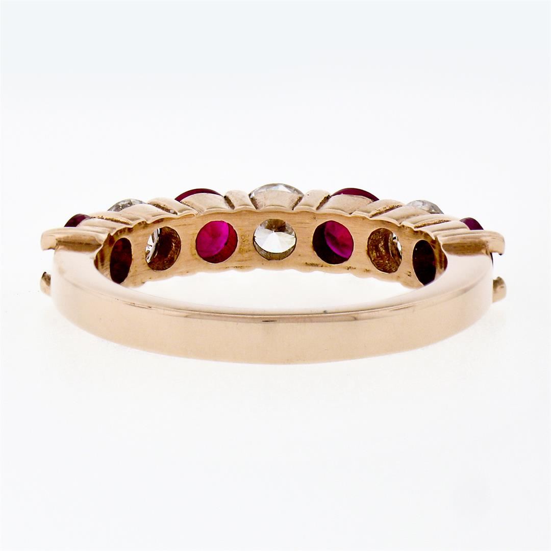 A new solid 14k rose gold band ring, with 4 round brilliant cut natural rubies (1.43ctw), alternated with 5 round brilliant cut natural diamonds (F/G- VS2; 0.86ctw). The ring is size 7.0, weighs a total of 4.45 grams, and measures 4.25mm wide.