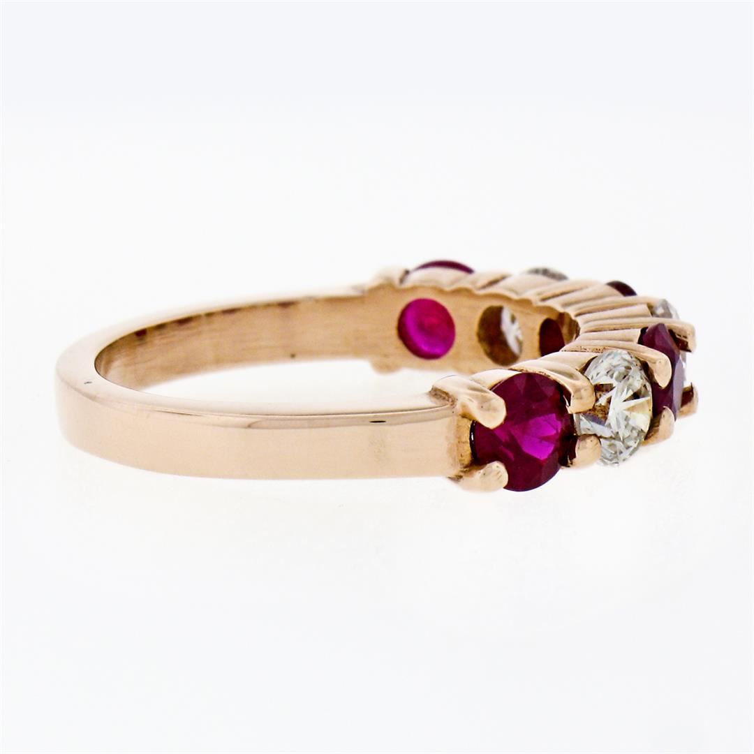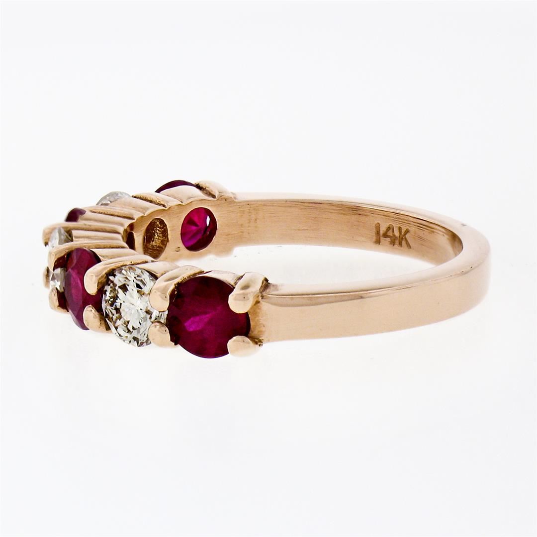 A new solid 14k rose gold band ring, with 4 round brilliant cut natural rubies (1.43ctw), alternated with 5 round brilliant cut natural diamonds (F/G- VS2; 0.86ctw). The ring is size 7.0, weighs a total of 4.45 grams, and measures 4.25mm wide.
