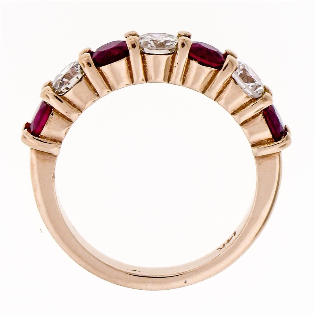 A new solid 14k rose gold band ring, with 4 round brilliant cut natural rubies (1.43ctw), alternated with 5 round brilliant cut natural diamonds (F/G- VS2; 0.86ctw). The ring is size 7.0, weighs a total of 4.45 grams, and measures 4.25mm wide.