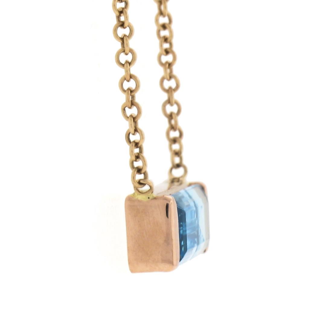 New 14K Rose Gold Emerald Cut Channel Set Blue Topaz Solitaire Pendant & Chain