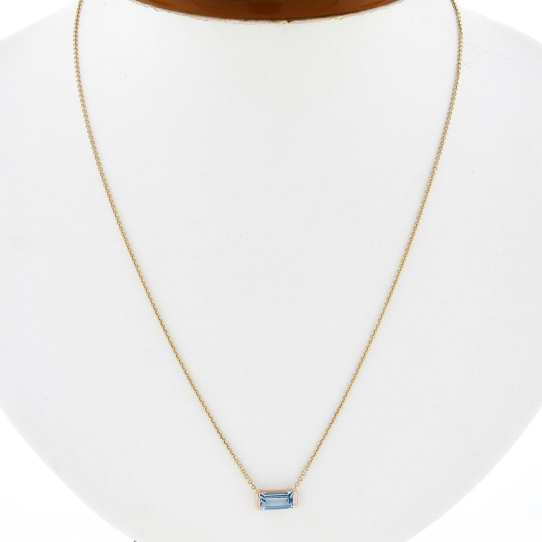 A new solid 14k rose gold pendant necklace, with 1 emerald cut natural blue topaz (0.78ct). Adjustable 16 or 18 inch cable link chain, 2.19 grams total weight, pendant measures 4.1x9.5mm.