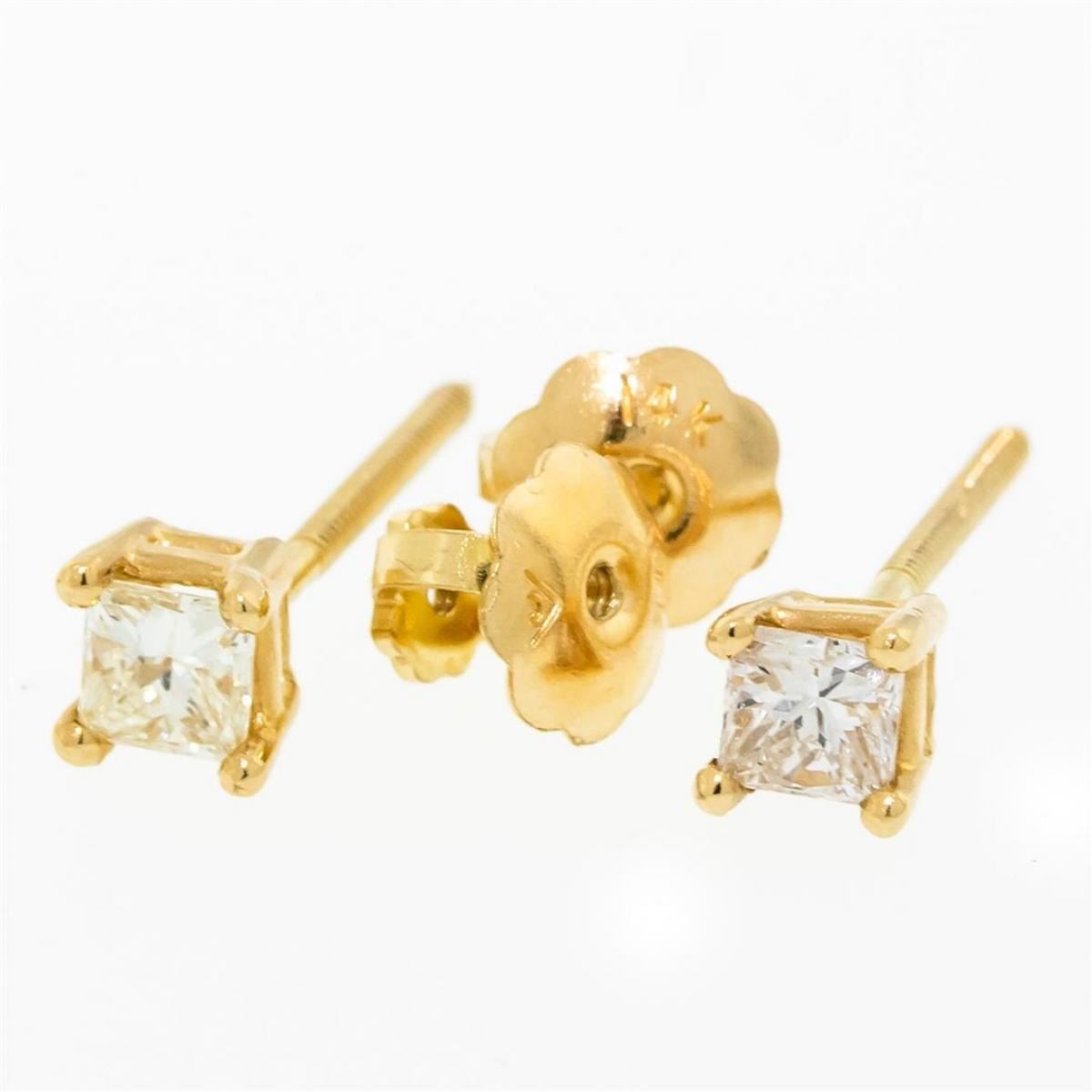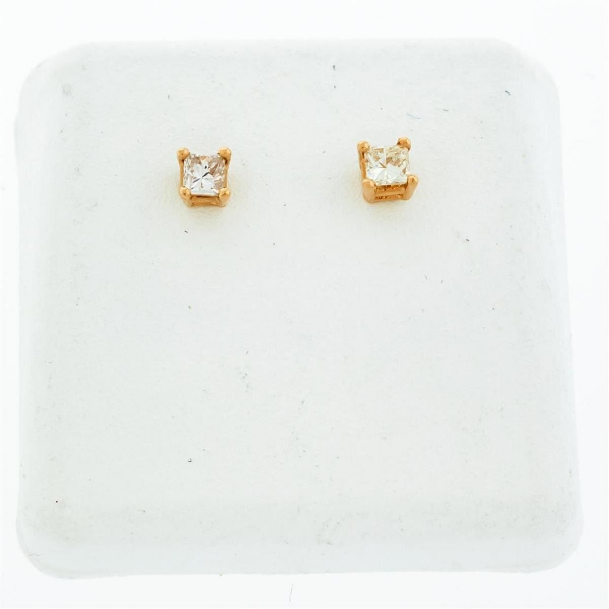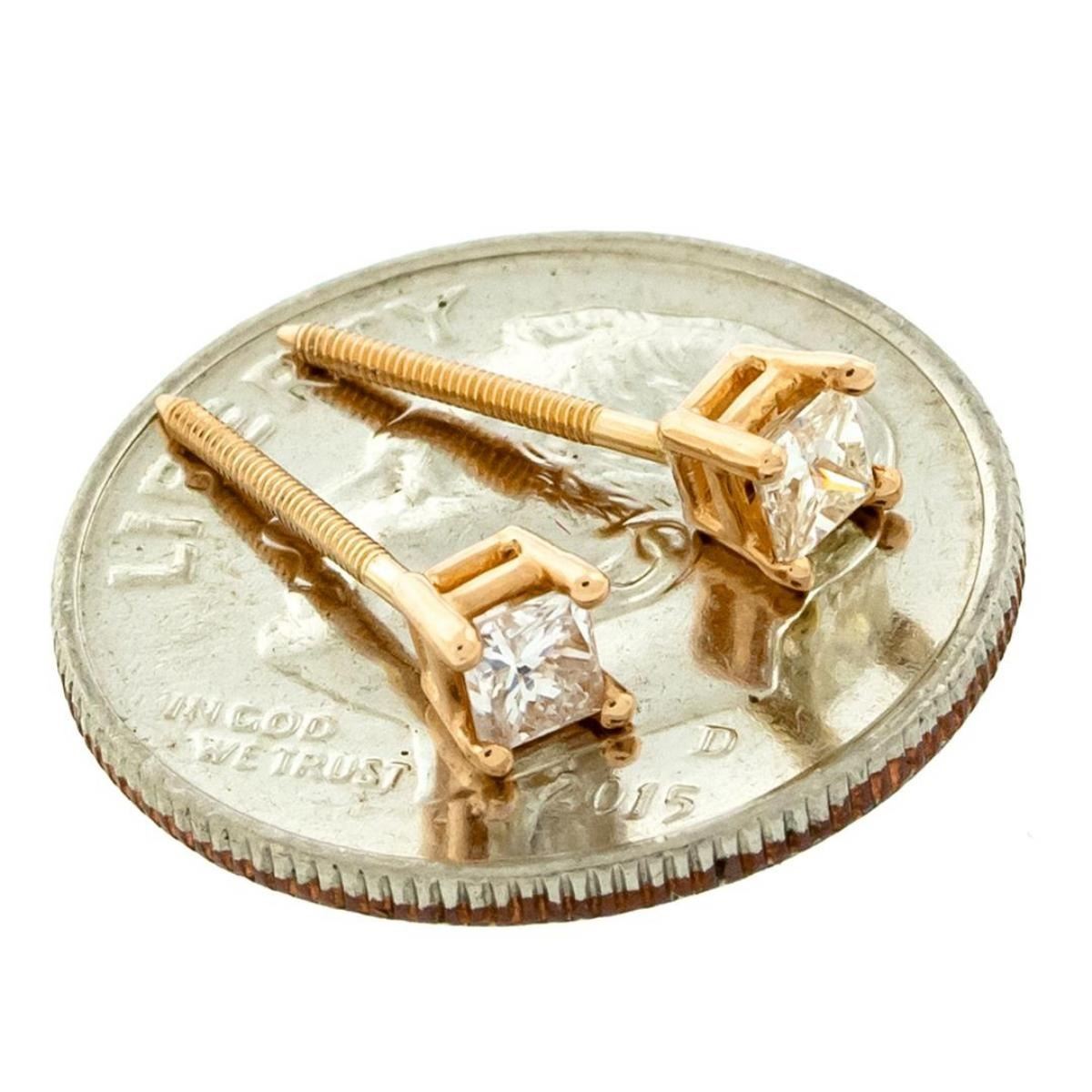 One Pair Of New 14K Rose Gold Ladies Diamond Stud Princess Cut Solitaire Earrings, Diamond Cut: Brilliant Princess Cut, Diamond Weight: .20 Carat; Stone Count: 2 Stones .10 Carat Each, Diamond Color: G To H, Clarity SI, Setting: 4 Prong Setting, Earring Type: Screw Back, Condition: Brand New.
