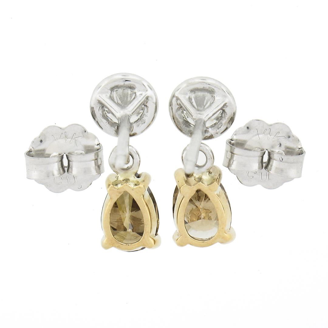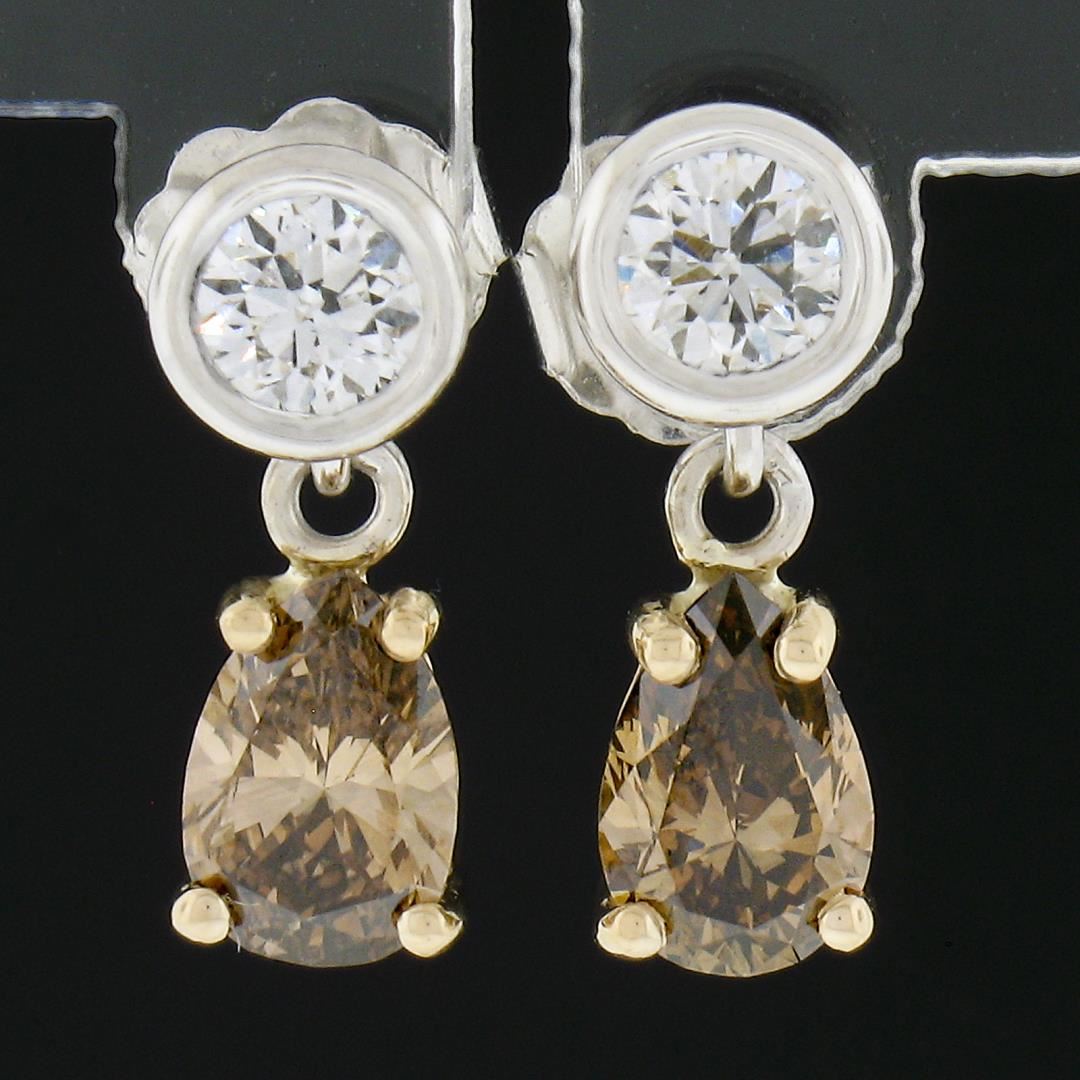 A new solid 14k yellow & white gold teardrop earrings, with 2 round cut natural diamonds (F/G - VS1/VS2 ; 0.41ctw), and 2 pear cut natural fancy brown diamonds (VS1/VS2 ; 1.01ctw). The earrings measure approximately 12.9x5.2mm and weigh a total of 1.50 grams.