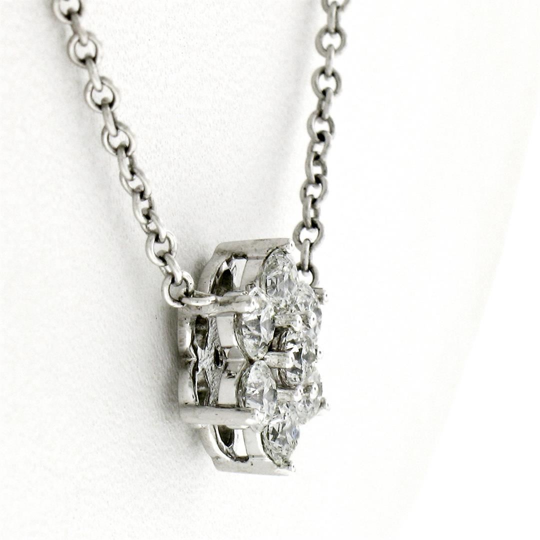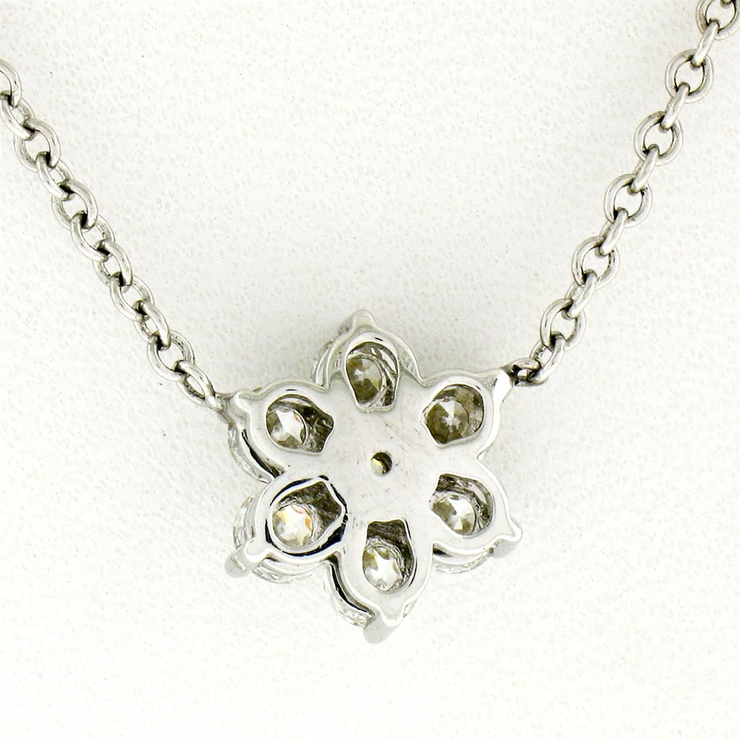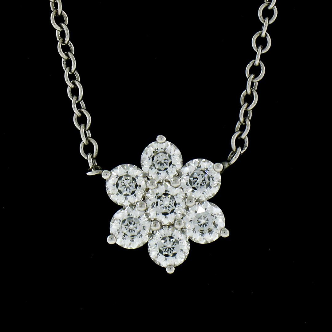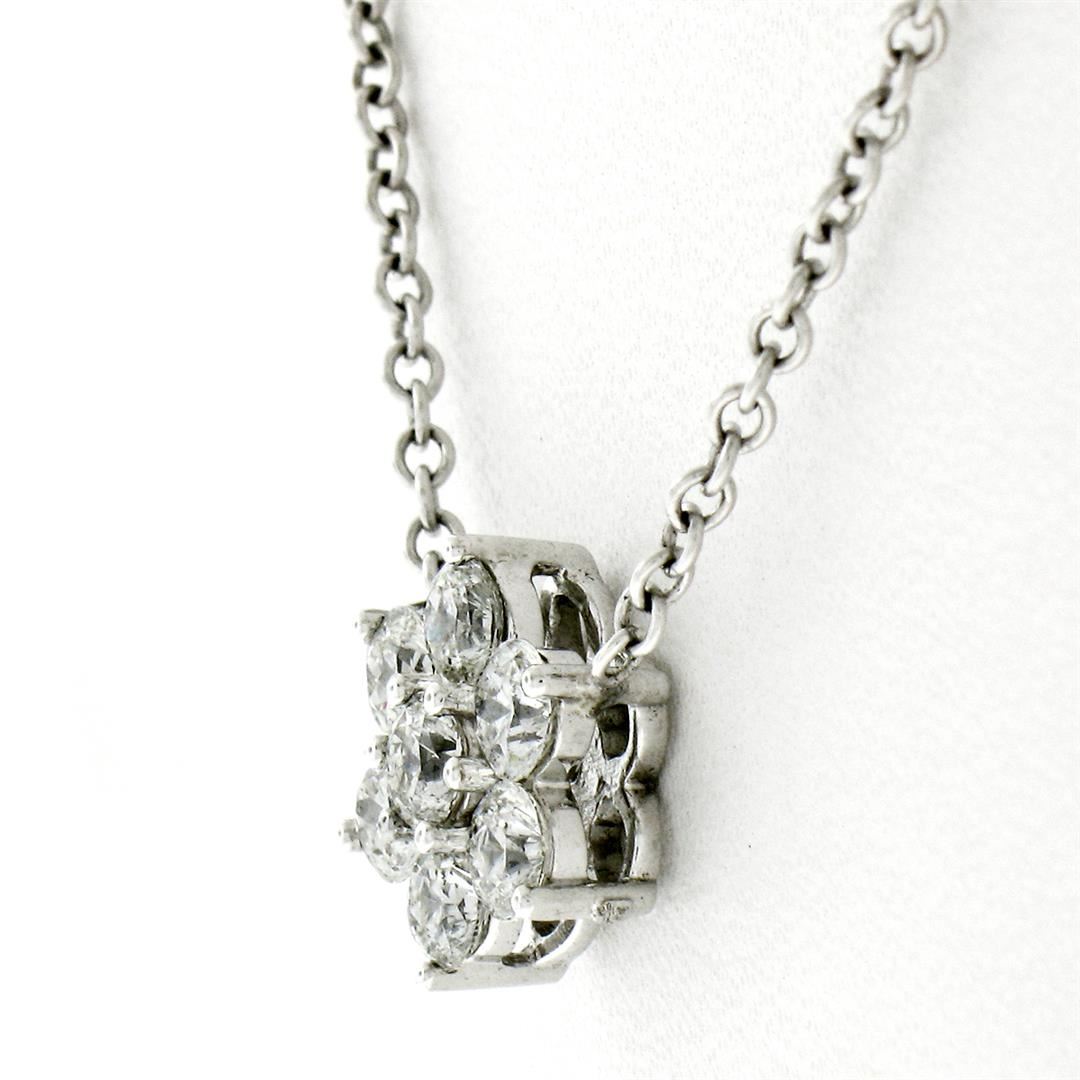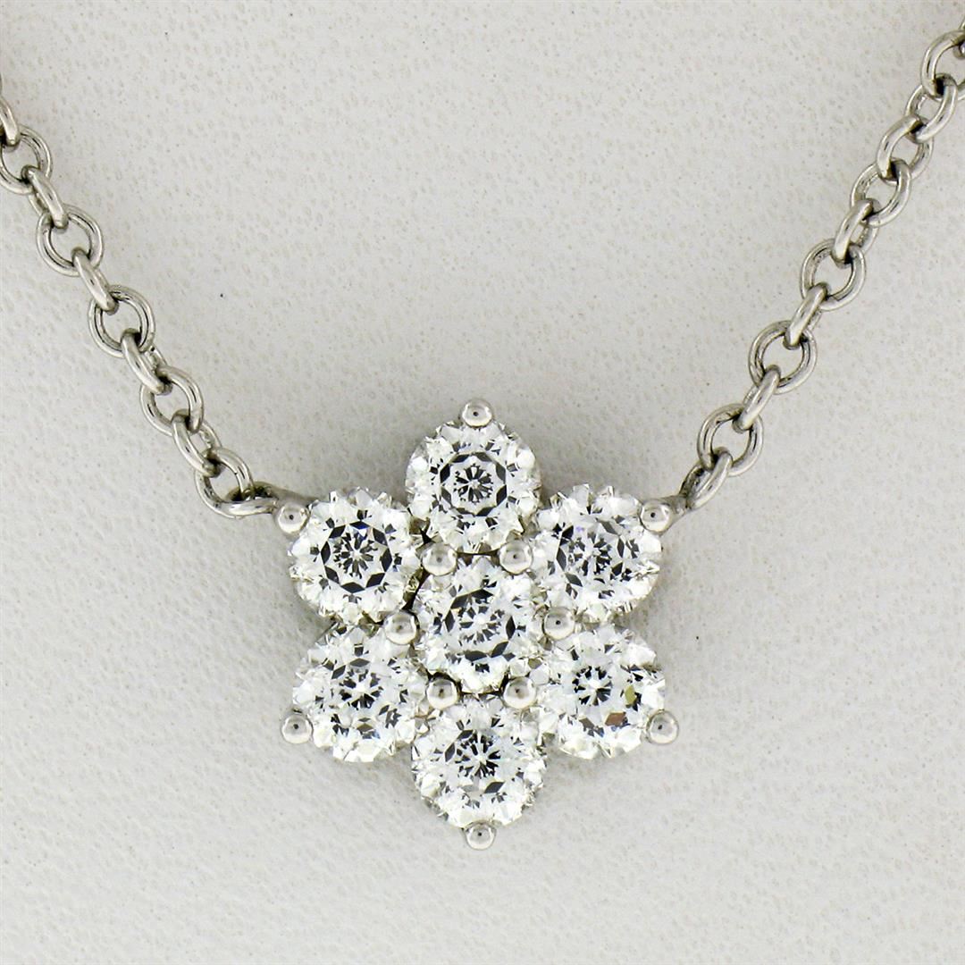 New 14K White Gold 1.05ctw G VS1 Diamond Petite Flower Cluster Pendant Necklace. Please see photos and description for all available information. A new solid 14k white gold flower cluster pendant necklace, with 7 round brilliant cut natural diamonds (G/H- VS1/VS2; 1.05ctw).  The pendant weighs a total of 3.94 grams, measures 10.90mm in diameter including the bail, and 17.25 inch cable link chain.