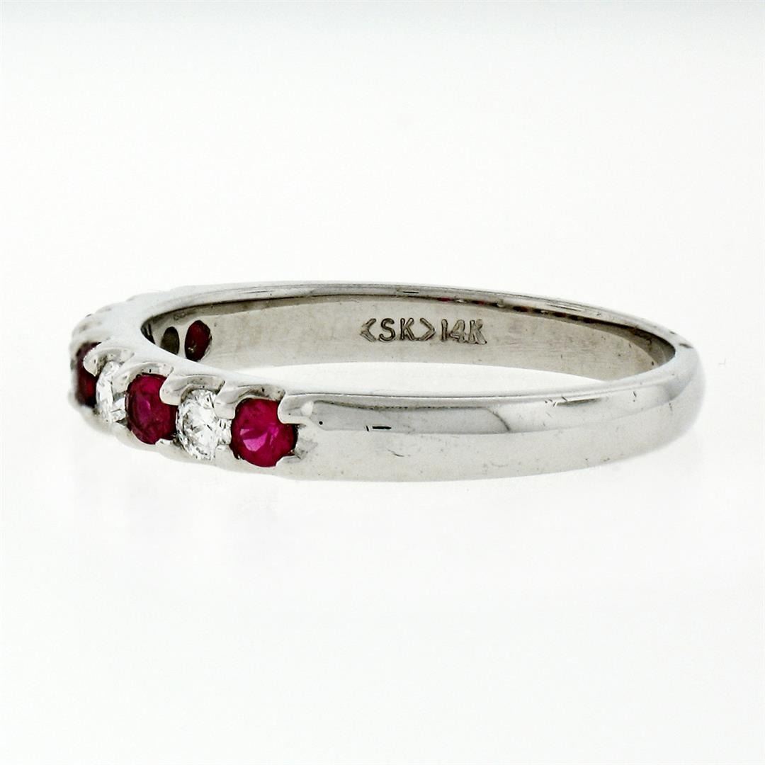 A new 14k white gold band ring, with 5 round brilliant cut natural rubies (0.34ctw), alternated with 4 round brilliant cut natural diamonds (F/G- VS1/VS2; 0.28ctw). The ring is size 7.0, weighs a total of 2.59 grams, and measures 3.0mm wide.
