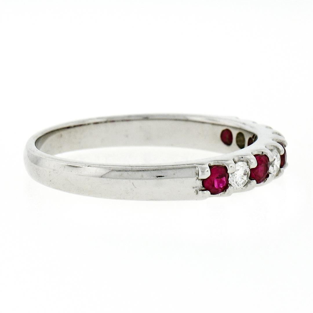 A new 14k white gold band ring, with 5 round brilliant cut natural rubies (0.34ctw), alternated with 4 round brilliant cut natural diamonds (F/G- VS1/VS2; 0.28ctw). The ring is size 7.0, weighs a total of 2.59 grams, and measures 3.0mm wide.