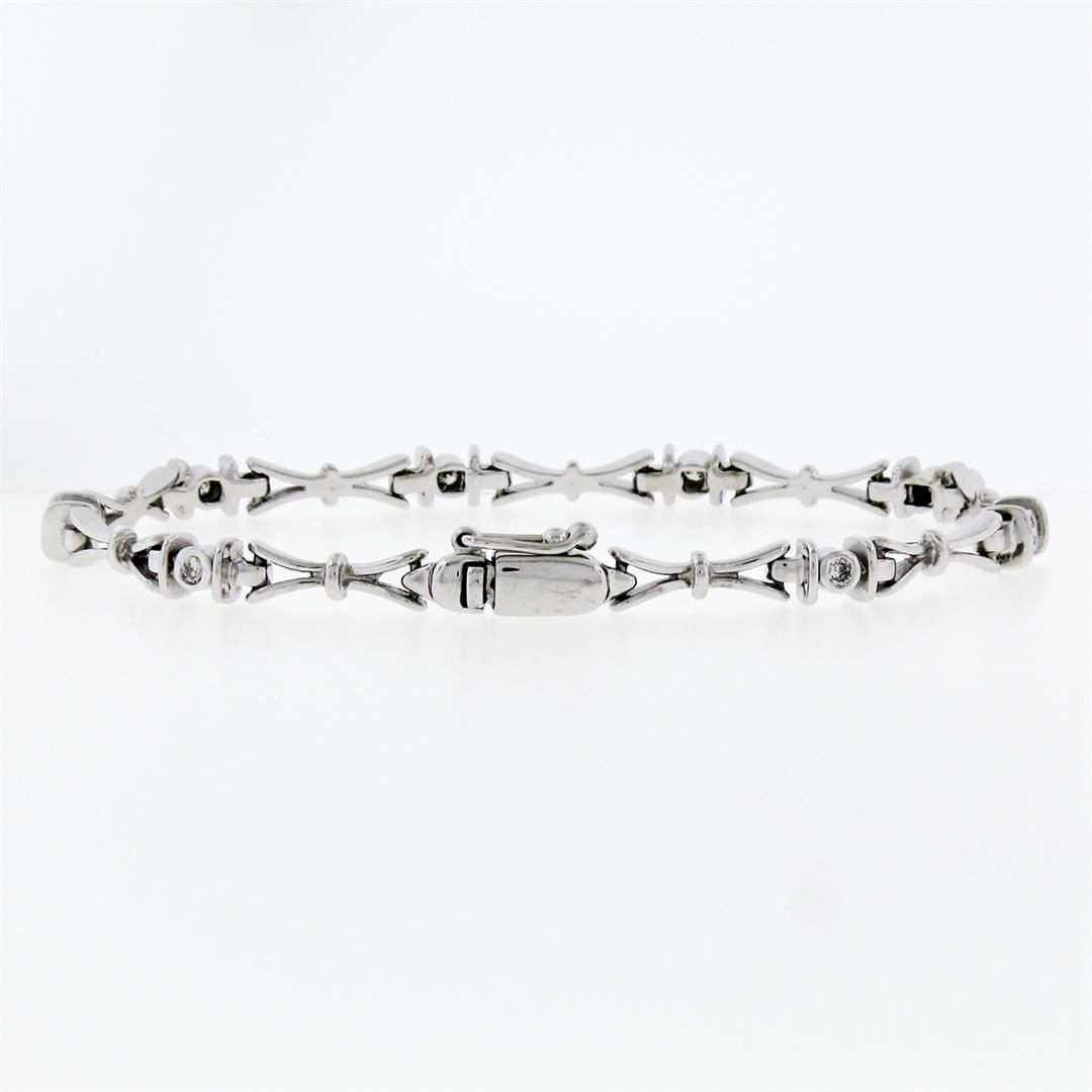 A new solid 14k white gold x link tennis bracelet, with 8 round brilliant cut natural diamonds (G- VS2; 0.33ctw). It weighs a total of 11.80 grams, measures 4.60mm wide, and measures 7 inches in length.
