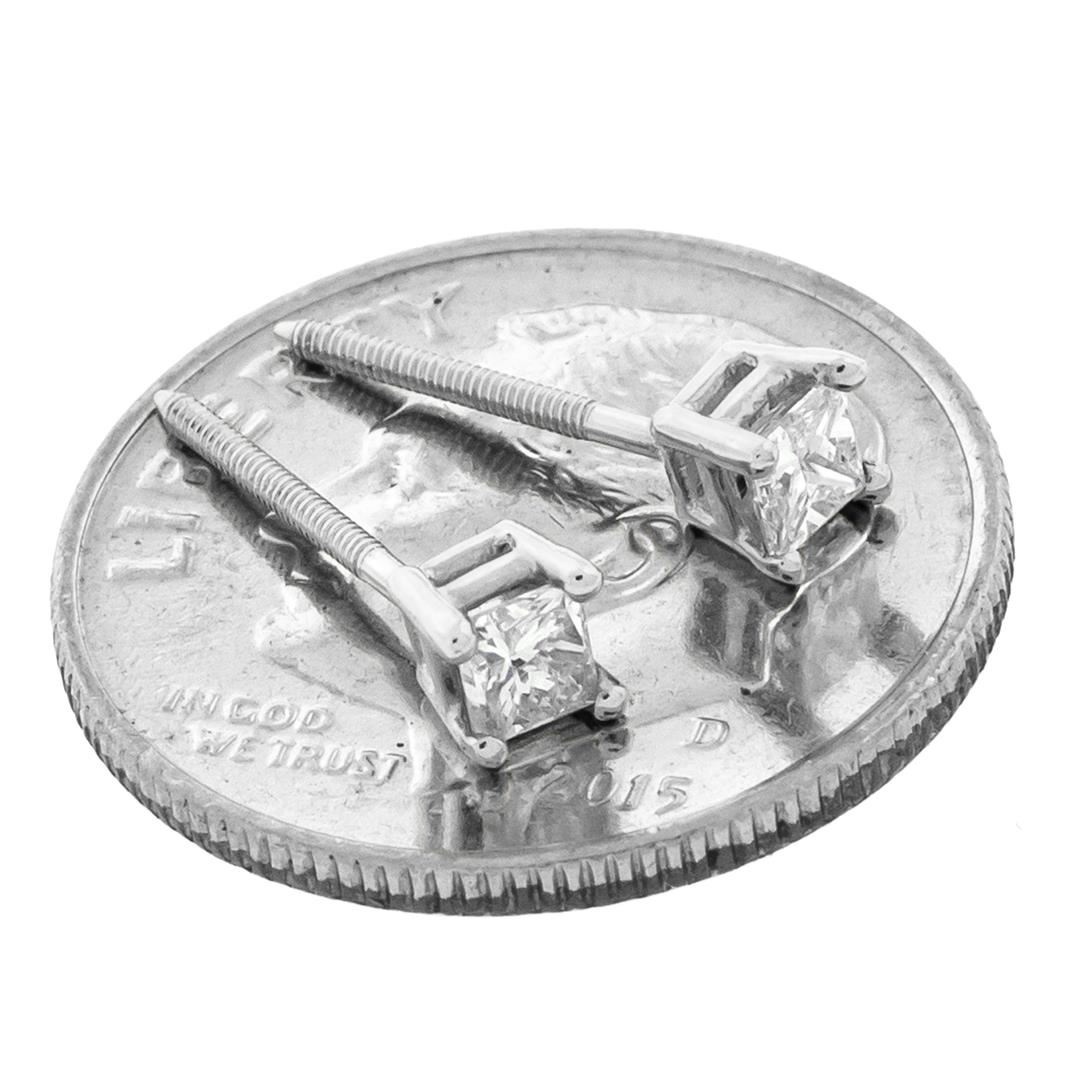 One Pair Of New 14K White Gold Ladies Diamond Stud Princess Cut Solitaire Earrings, Diamond Cut: Brilliant Princess Cut, Diamond Weight: .20 Carat; Stone Count: 2 Stones .10 Carat Each, Diamond Color: G To H, Clarity SI, Setting: 4 Prong Setting, Earring Type: Screw Back, Condition: Brand New.