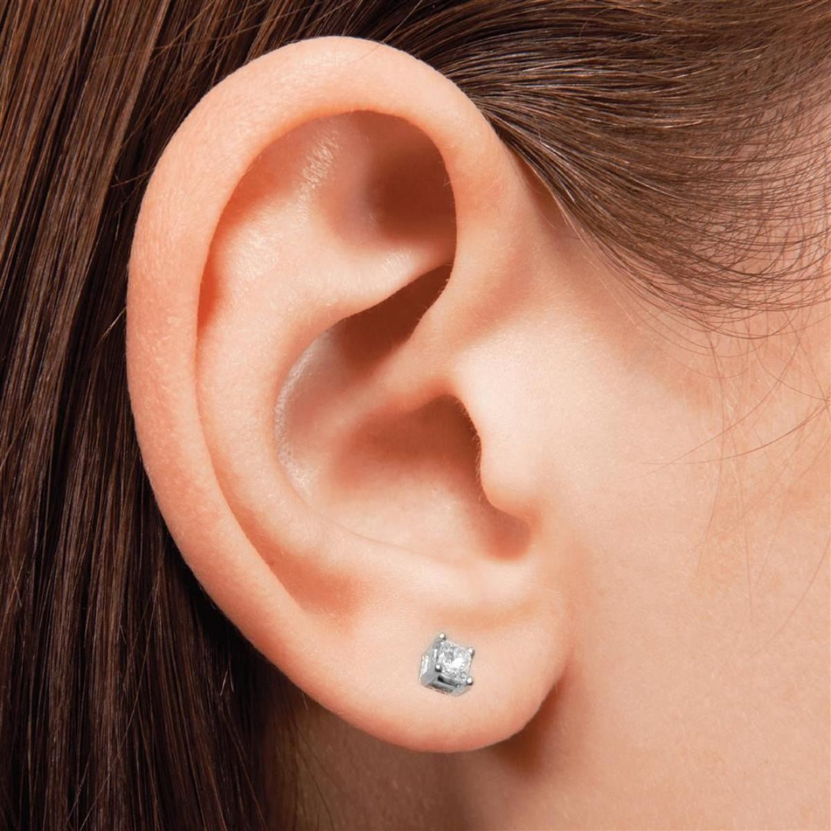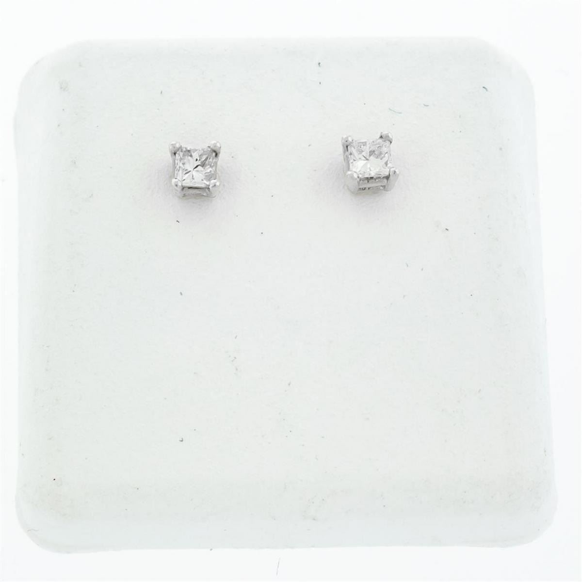 One Pair Of New 14K White Gold Ladies Diamond Stud Princess Cut Solitaire Earrings, Diamond Cut: Brilliant Princess Cut, Diamond Weight: .20 Carat; Stone Count: 2 Stones .10 Carat Each, Diamond Color: G To H, Clarity SI, Setting: 4 Prong Setting, Earring Type: Screw Back, Condition: Brand New.