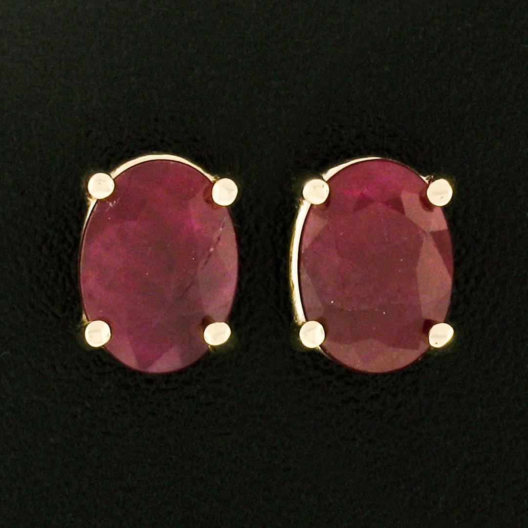A new solid 14k yellow gold stud earrings, with 2 oval cut natural rubies (7.00x5.10mm- 2.00ctw). The earrings measure approximately 7.10x5.25mm and weigh a total of 1.44 grams.