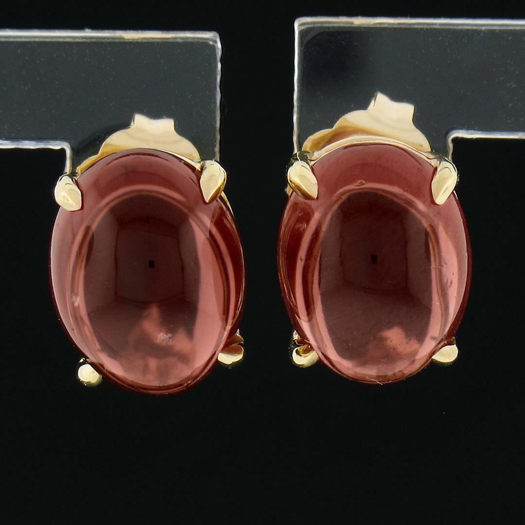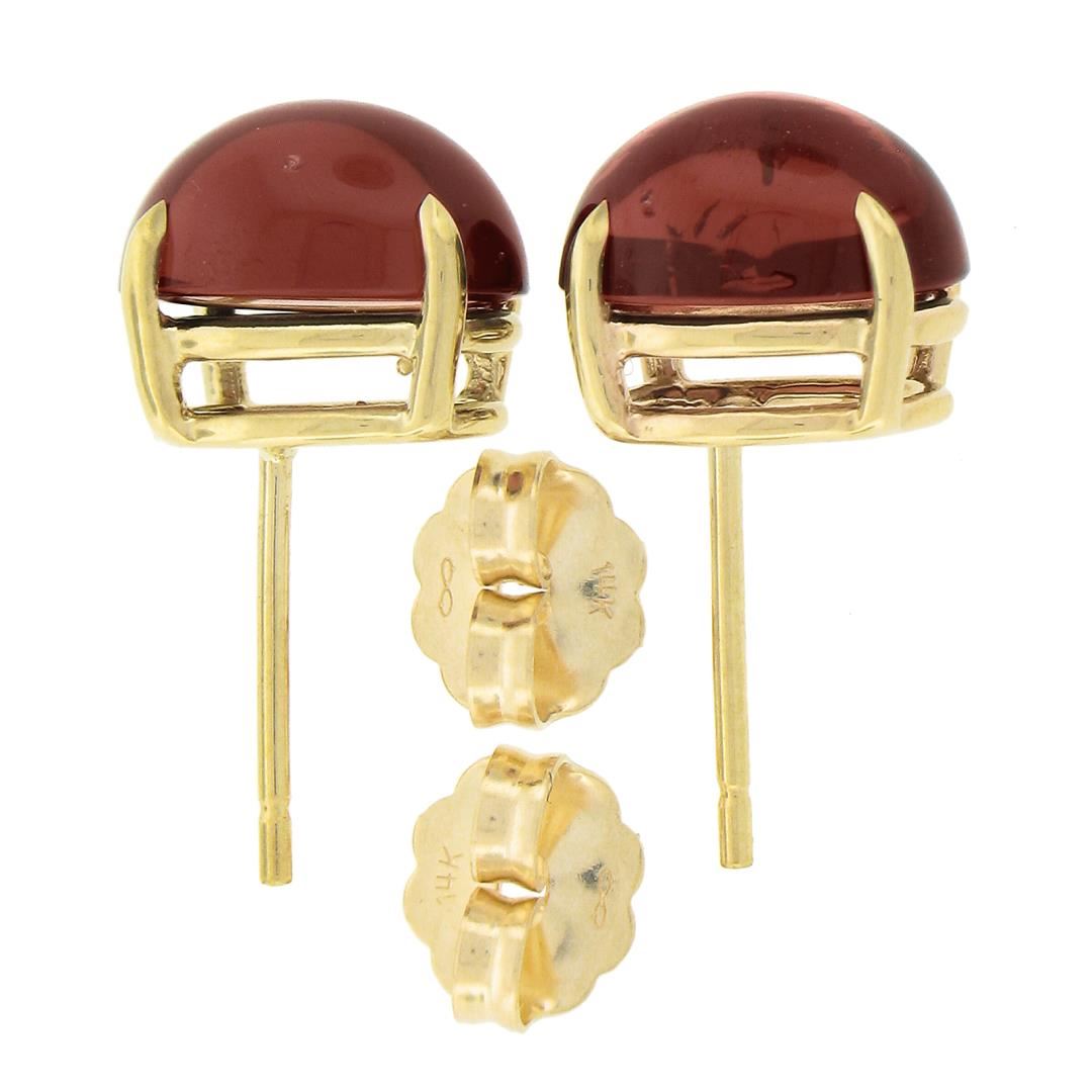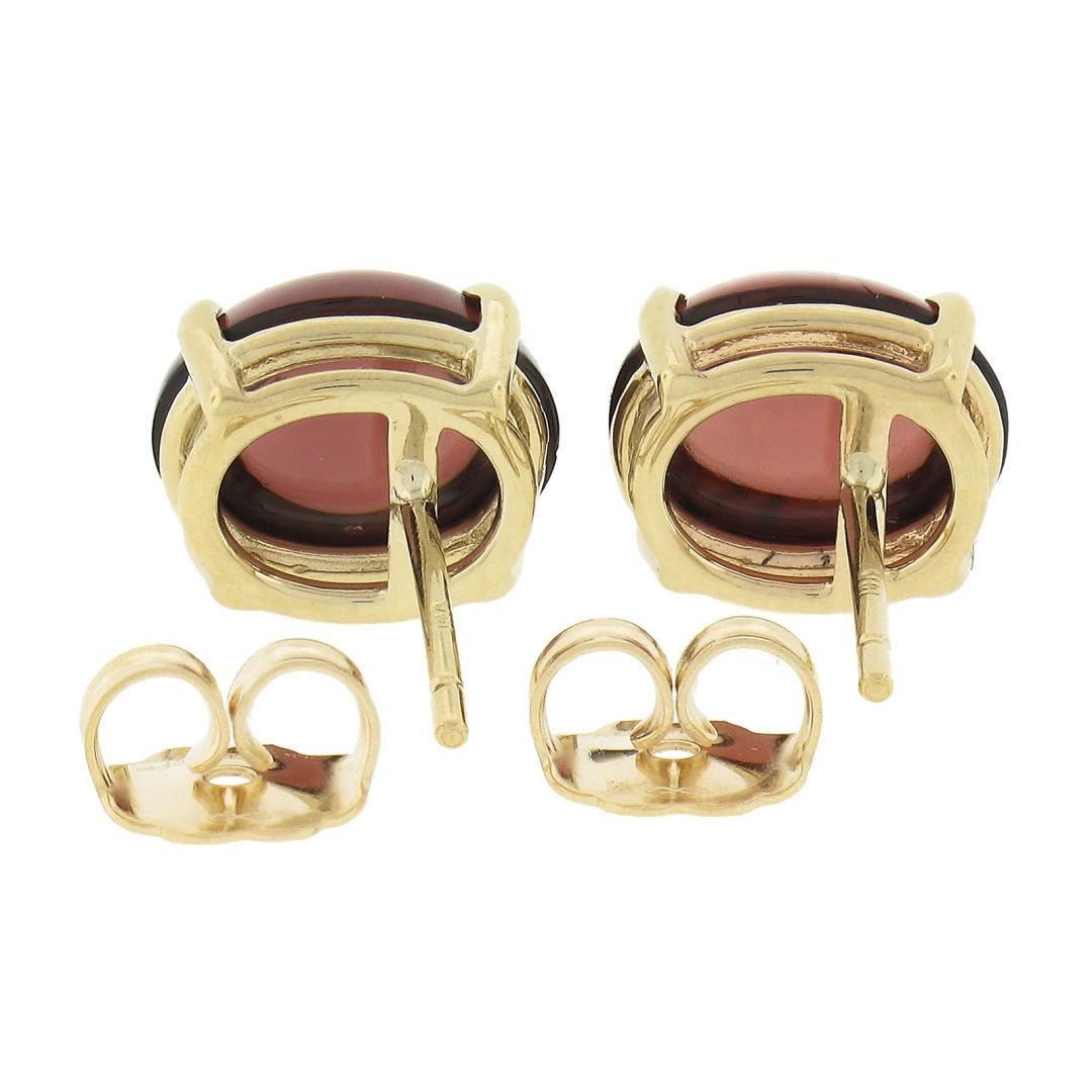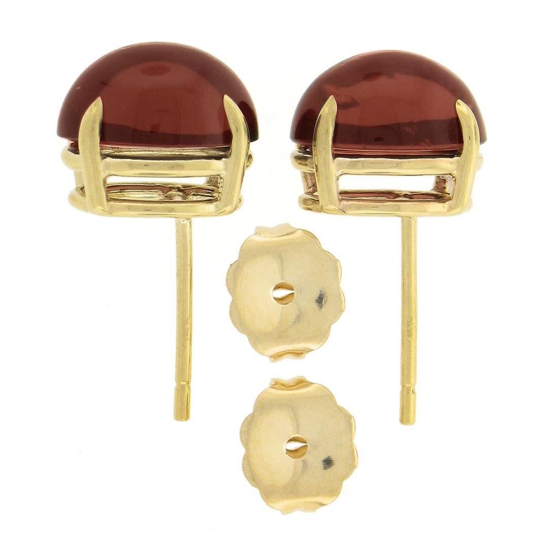 A new solid 14k yellow gold stud earrings, with 2 oval cabochon cut natural garnets (5.57ctw). The earrings measure approximately 8.8x6.9mm and weigh a total of 2.56 grams.
