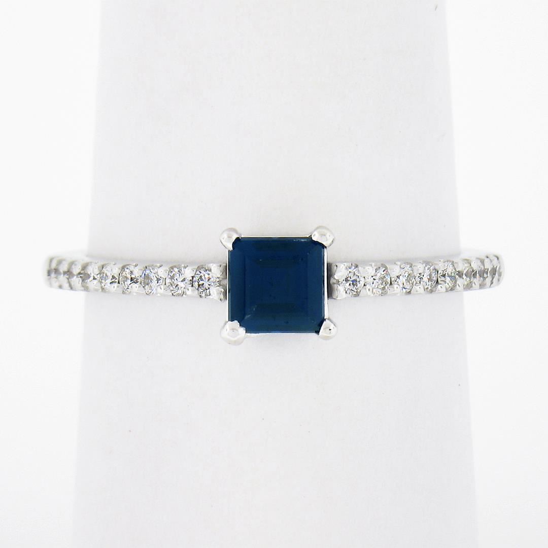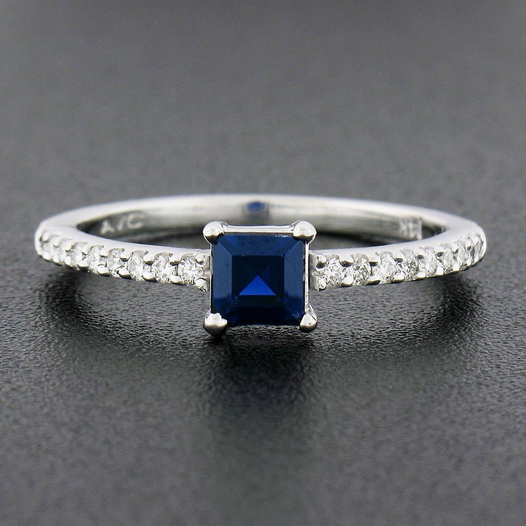 a new solid 14k white gold ring, with 1 square step cut natural sapphire (0.50ct), and 18 round cut natural diamonds (F/G - VS1/VS2 ; 0.18ctw ). The ring is size 7.0, weighs a total of 2 grams, and measures 5.3mm wide.