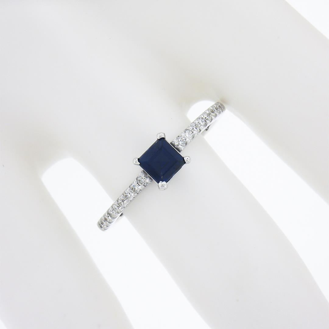 a new solid 14k white gold ring, with 1 square step cut natural sapphire (0.50ct), and 18 round cut natural diamonds (F/G - VS1/VS2 ; 0.18ctw ). The ring is size 7.0, weighs a total of 2 grams, and measures 5.3mm wide.