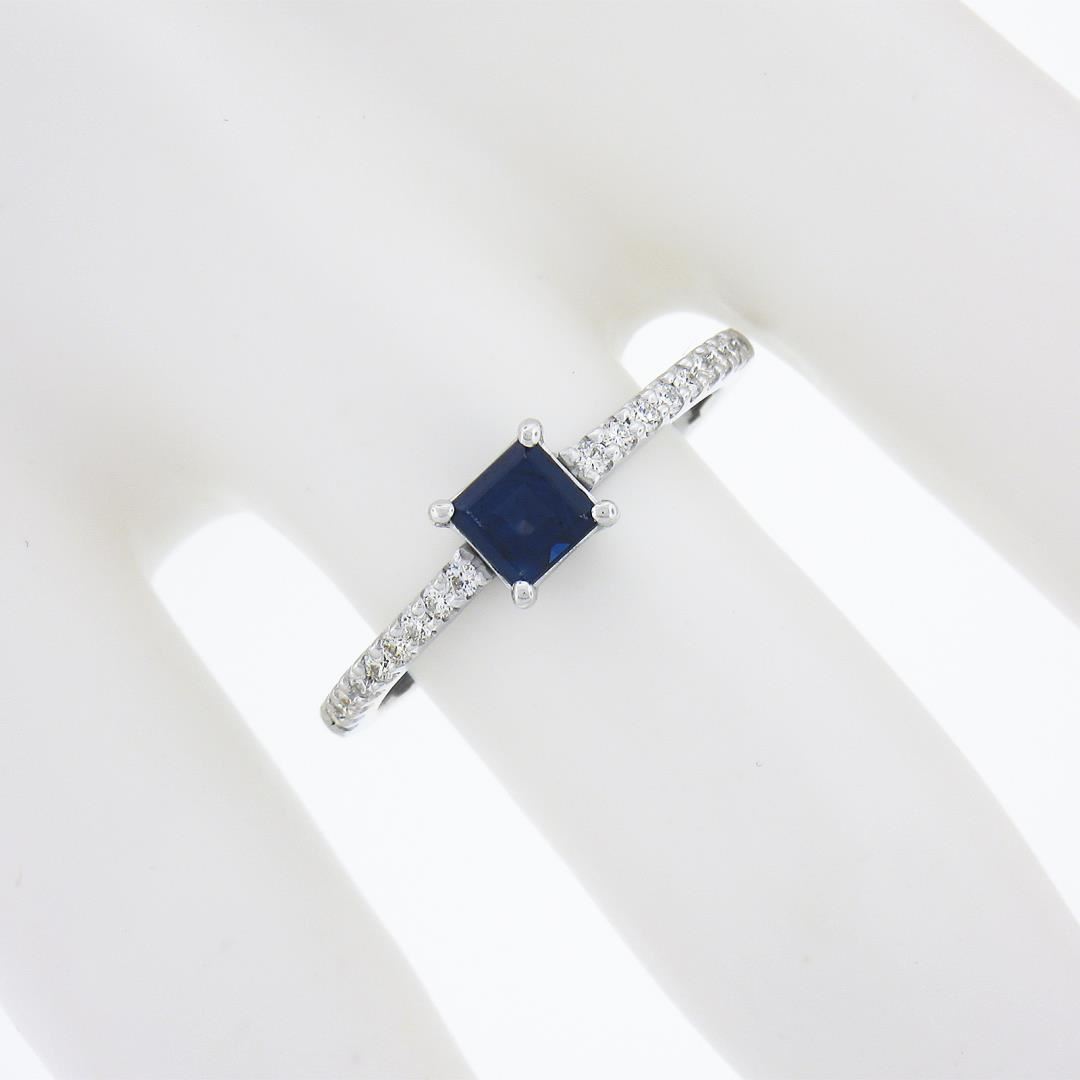 A solid 14k white gold engagement ring, with 1 square cut natural sapphire (0.52ct ), and 18 round cut natural diamonds (F/G - VS1/VS2 ; 0.18ctw). The ring is size 7.5, weighs a total of 2.02 grams, and measures 5.1mm wide.