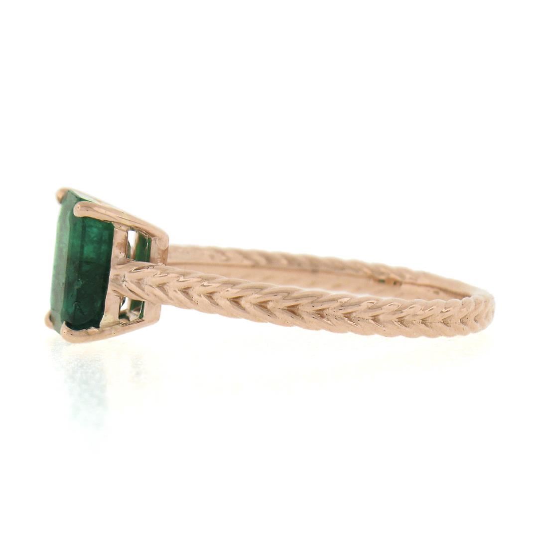 A new solid 14k rose gold solitaire ring, with 1 GIA graded octagonal cut natural emerald ( 1.43ct ). The ring is size 6.5, weighs a total of 2.56 grams, and measures 7.9mm wide. Comes with all original relevant certifications.