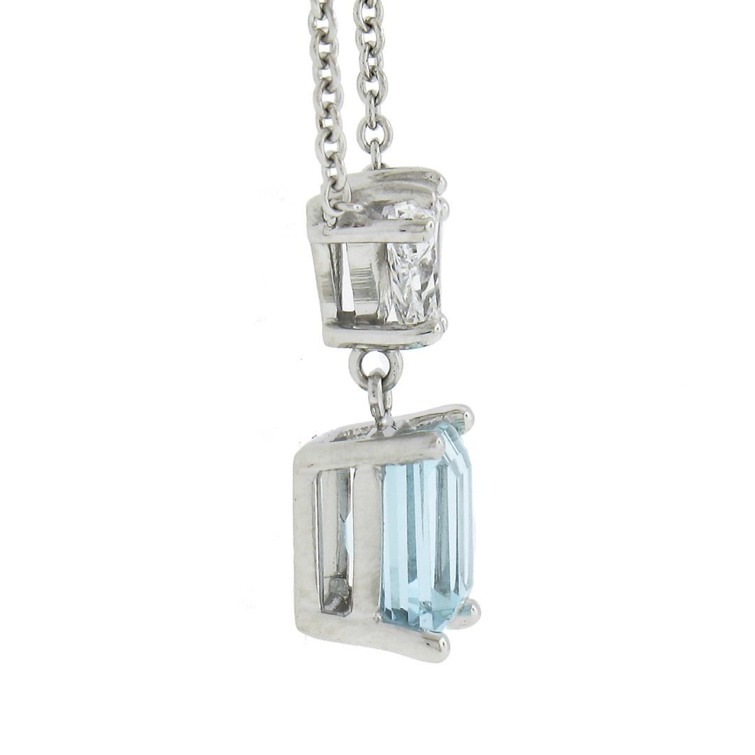 A new solid 14k white gold pendant necklace, with 1 square step cut natural aquamarine (1.43ct), and 1 trillion cut natrual diamond (G - SI1 ; 0.43ct). Adjustable at 16 or 18 inch cable link chain, 3.59 grams total weight, pendant measures 15.9x7.6mm.