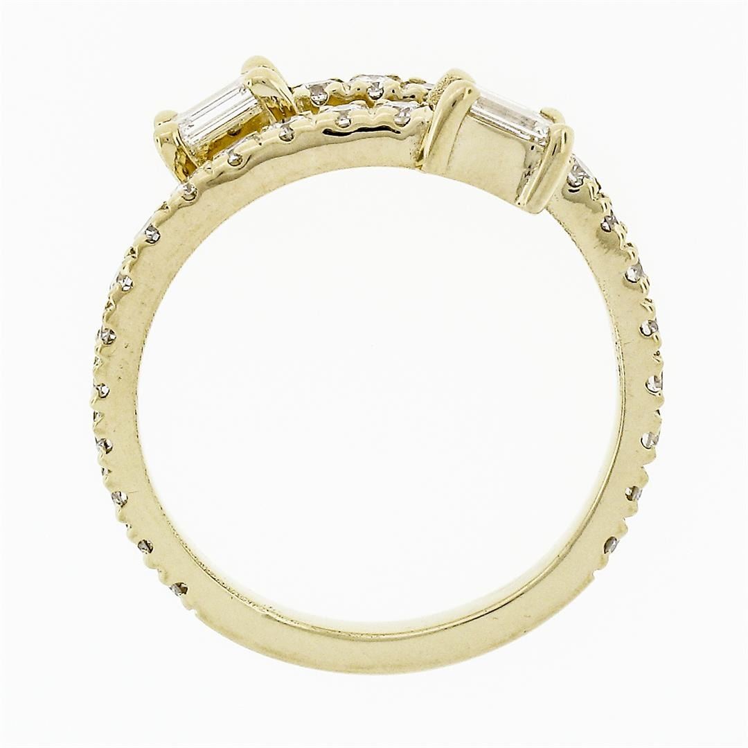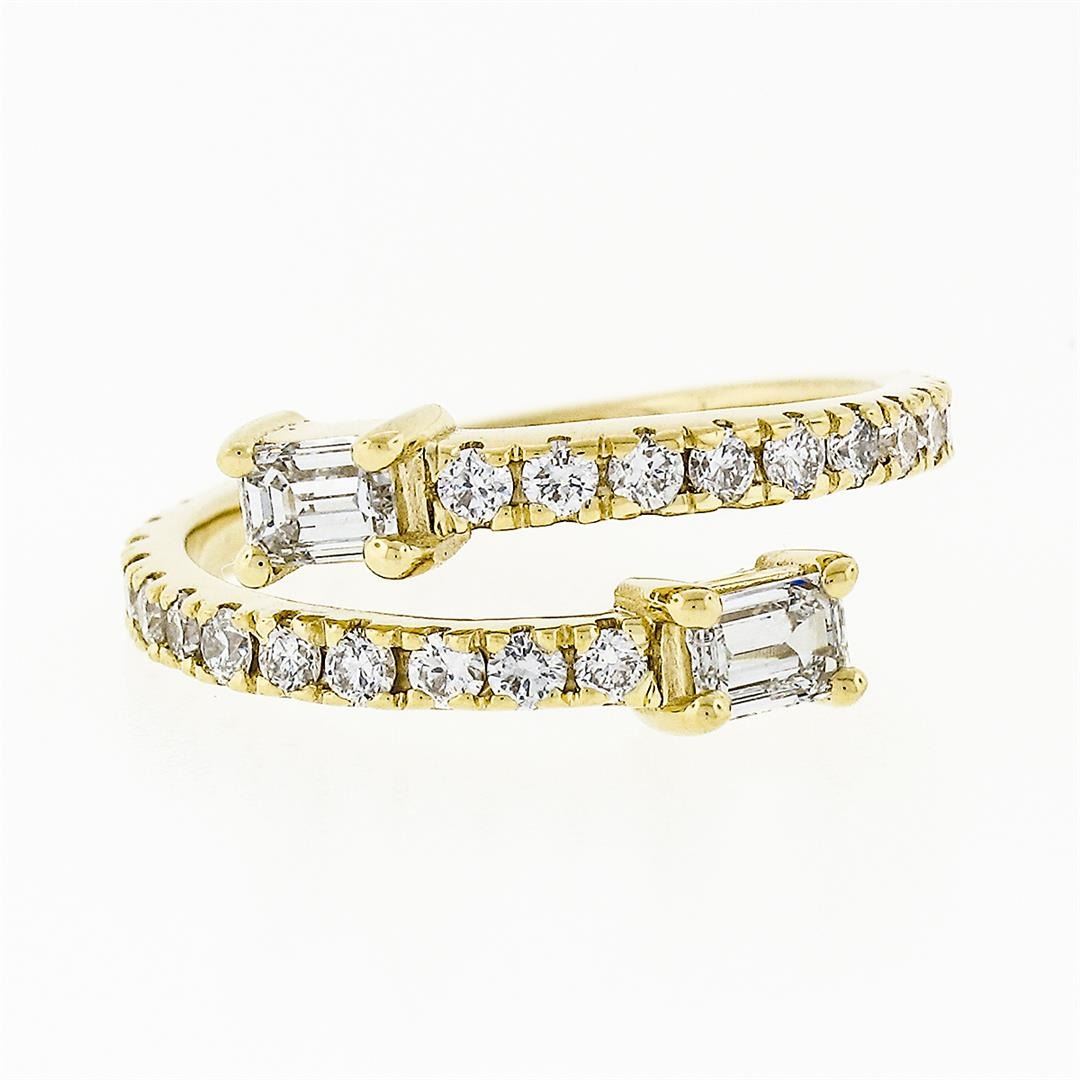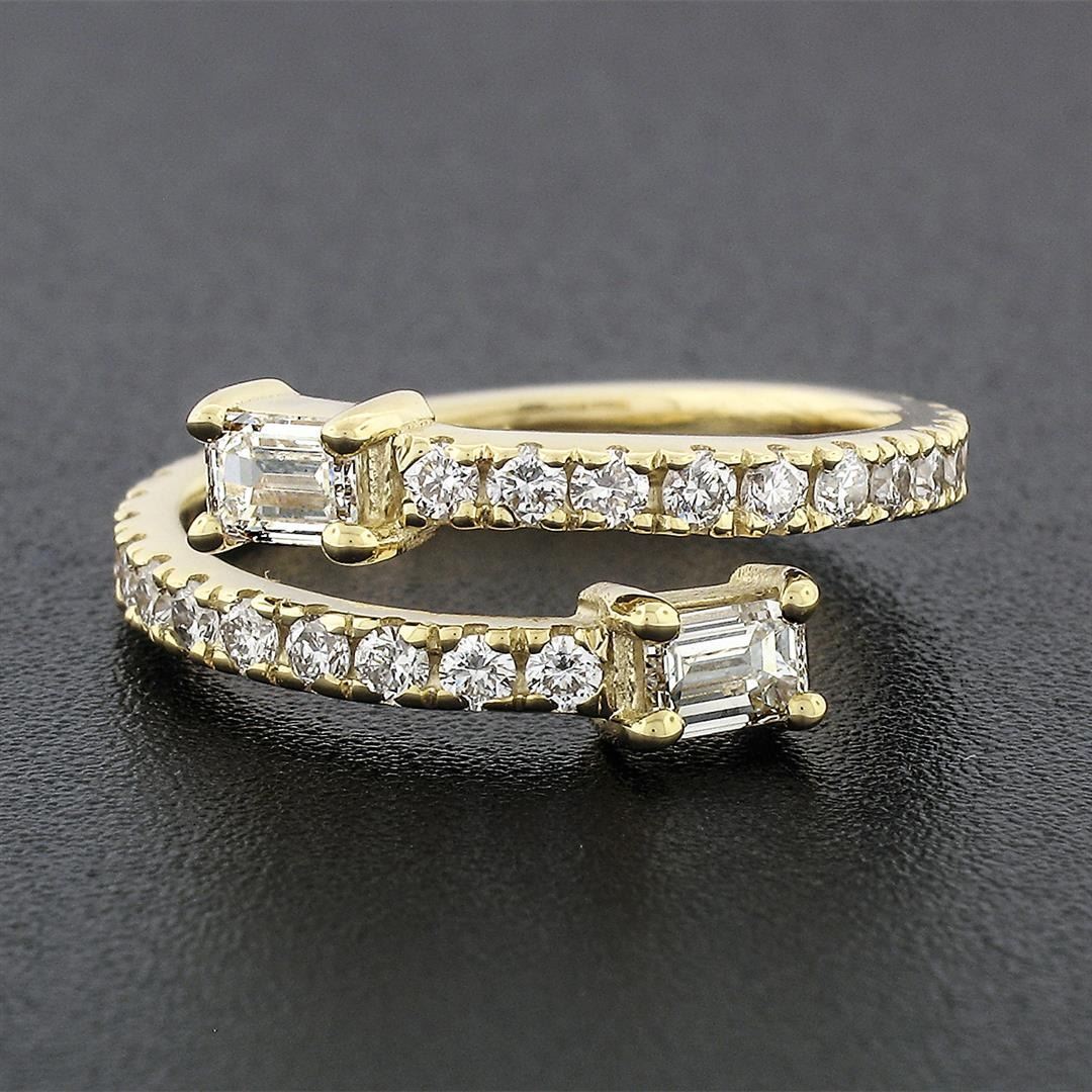A New solid 14k yellow gold Moi et Toi bypass band ring, with 2 emerald cut natural diamonds (G/H - VS1 ; 0.42ctw), and 26 round brilliant cut natural diamonds (G/H - VS1/VS2 ; 0.50ctw). The ring is size 6.0, weighs a total of 3.01 grams, and measures 7.9