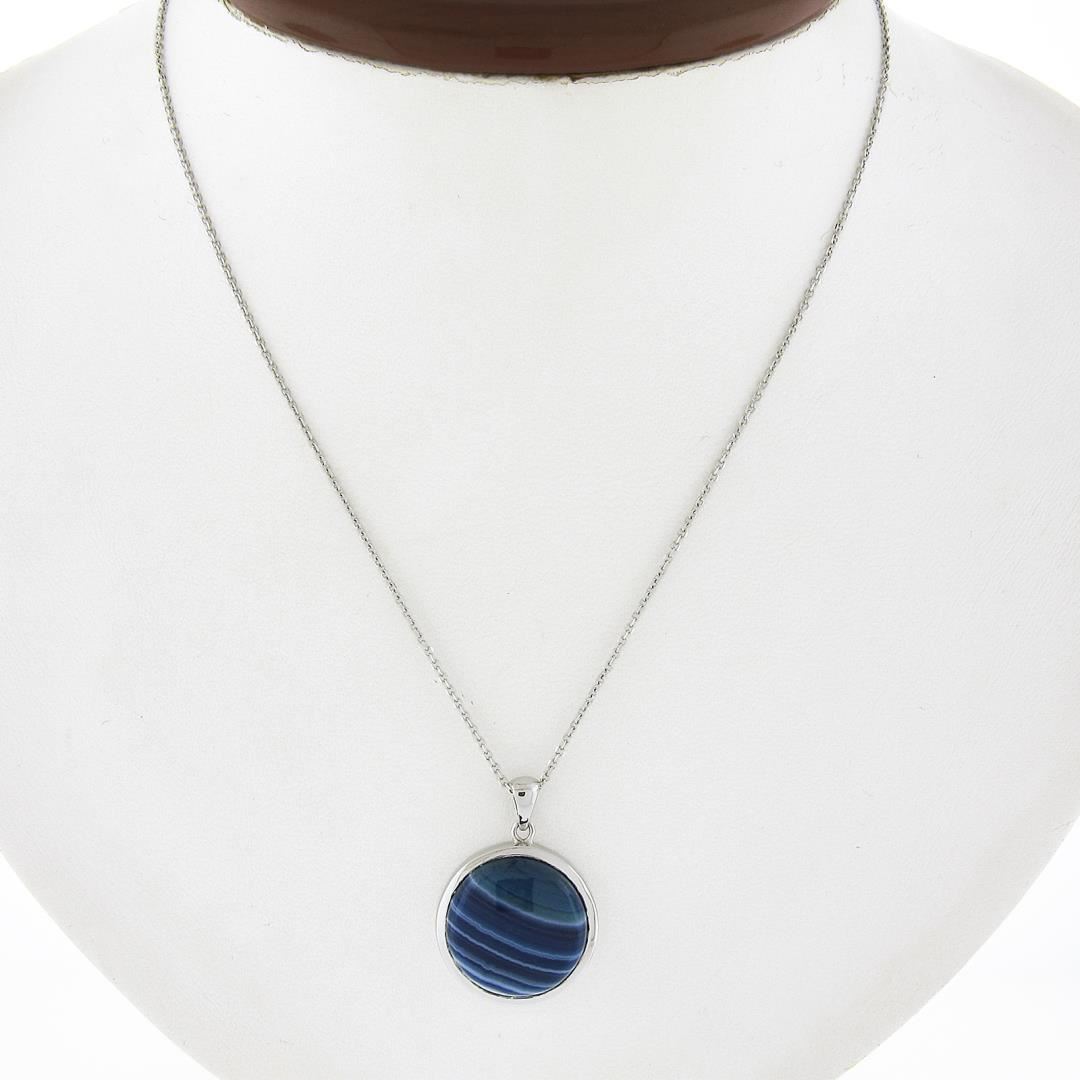 A new solid 14k white gold pendant necklace, with 1 round cabohcon cut natrual banded agate (15.6mm). Adjustable 16 or 18 inch cable link chain, 6.94 grams total weight, pendant measures 25.1x18.5mm.