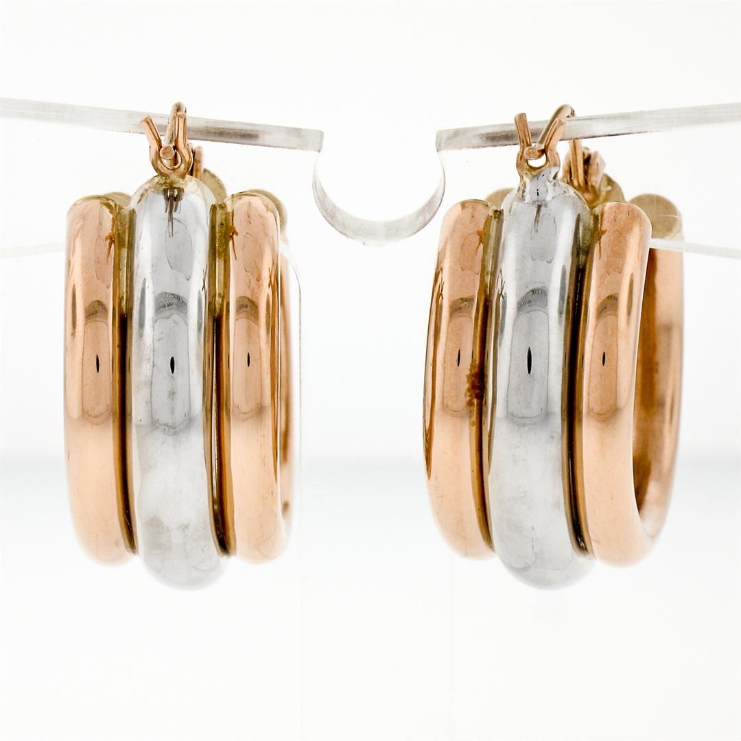 A new pair of 14k white and rose gold hoop earrings featuring a puffed triple tube design. The earrings measure approximately 10.25mm wide, 22.65mm in diameter, and weigh a total of 6.00 grams.
