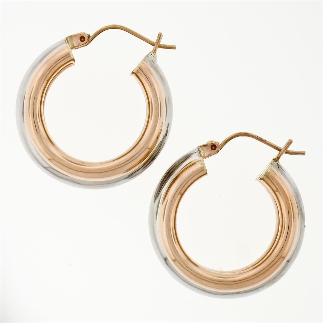 A new pair of 14k white and rose gold hoop earrings featuring a puffed triple tube design. The earrings measure approximately 10.25mm wide, 22.65mm in diameter, and weigh a total of 6.00 grams.