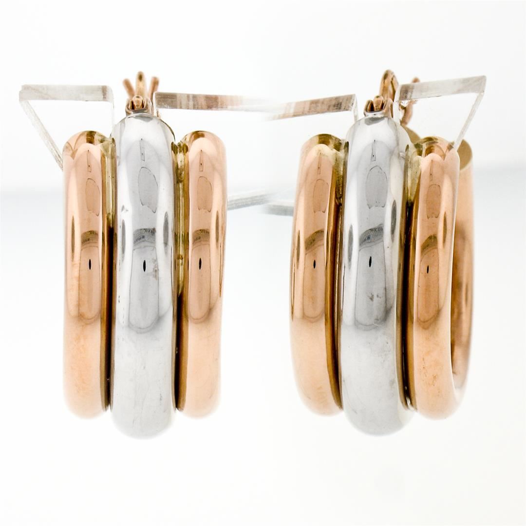 A new pair of 14k white and rose gold hoop earrings featuring a puffed triple tube design. The earrings measure approximately 10.25mm wide, 22.65mm in diameter, and weigh a total of 6.00 grams.