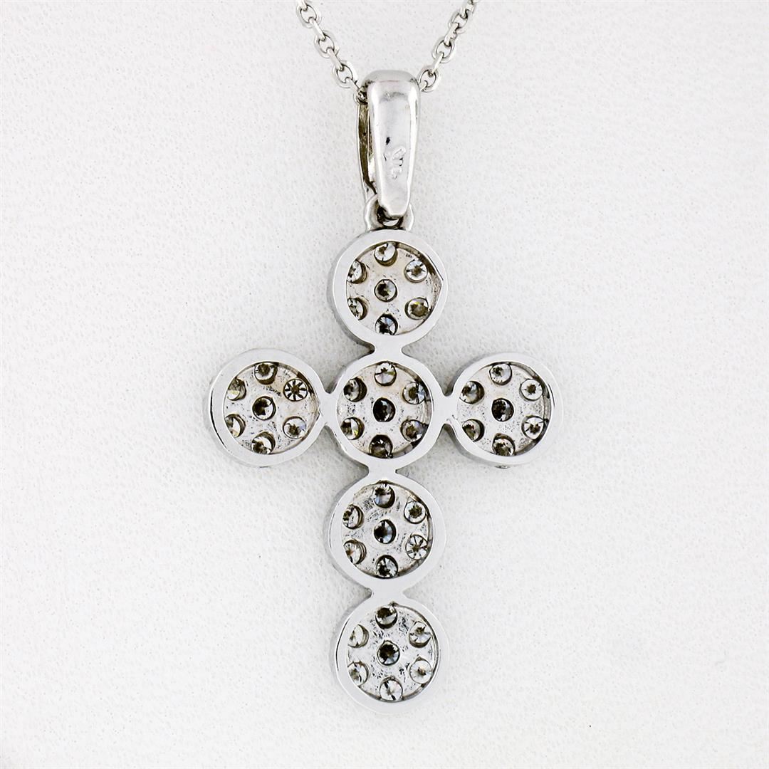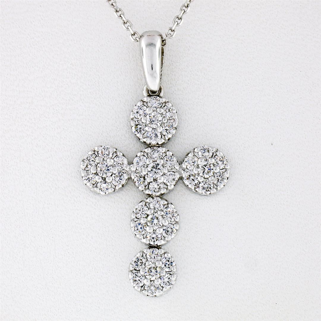 A new 14k white gold cross pendant necklace featuring 42 round brilliant diamonds (E/F - VVS1/VVS2 ;0.85ctw) set in 6 round clusters. 18 inch cable link chain, 4.48 grams total weight, pendant measures 30.7x17.0mm.