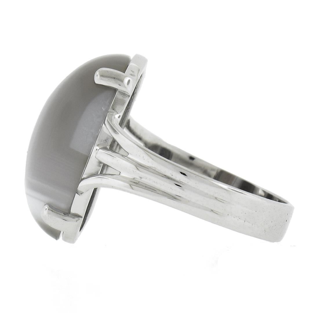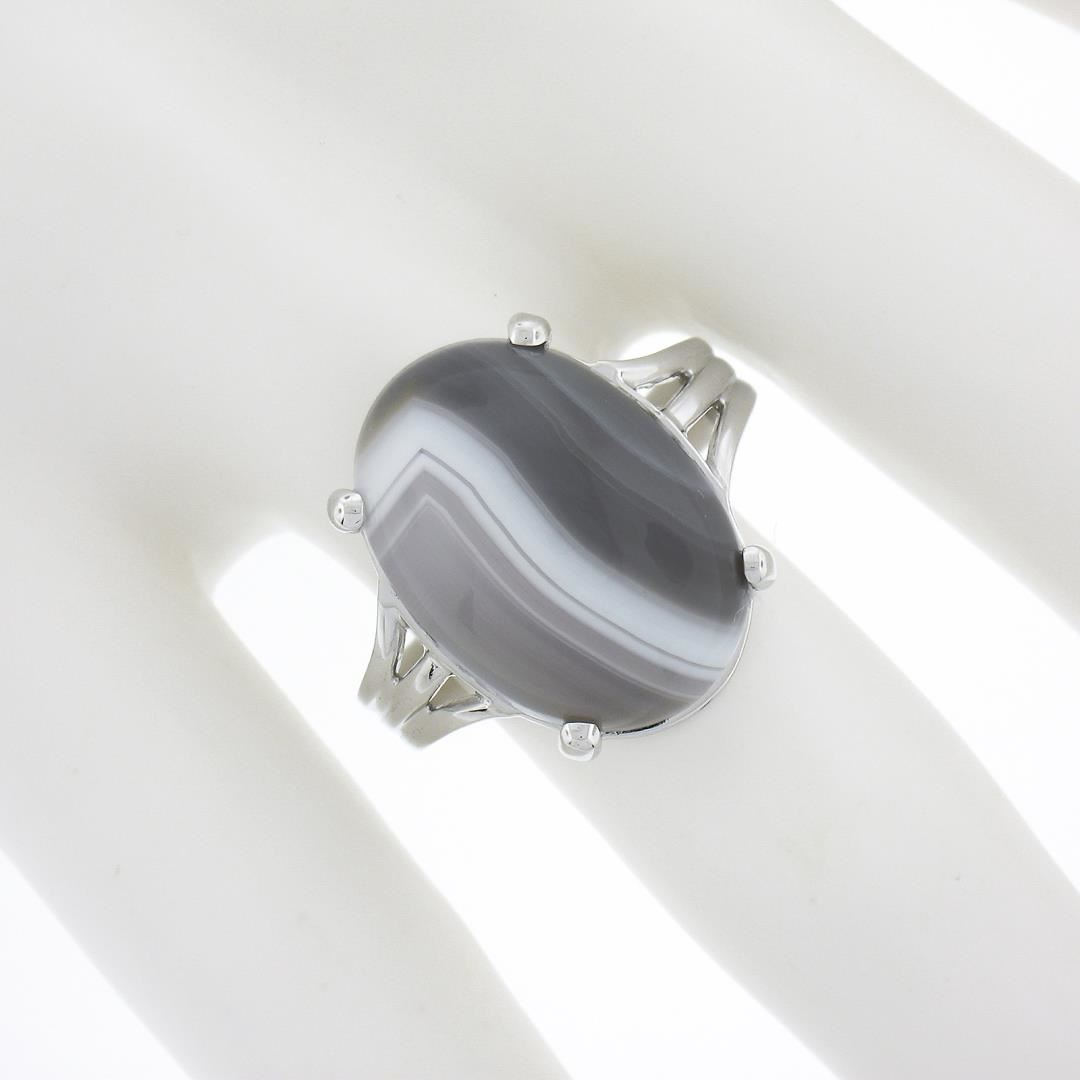 A new solid 14k white gold ring, with 1 oval cabochon cut natural agate (18.2x13mm). The ring is size 8.0, weighs a total of 5.31 grams, and measures 18.6mm wide.