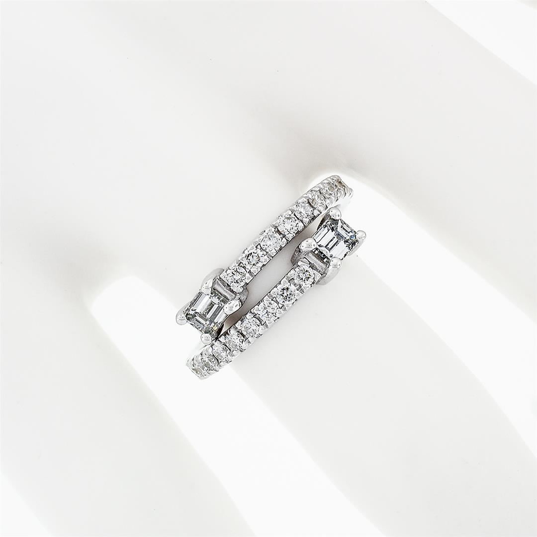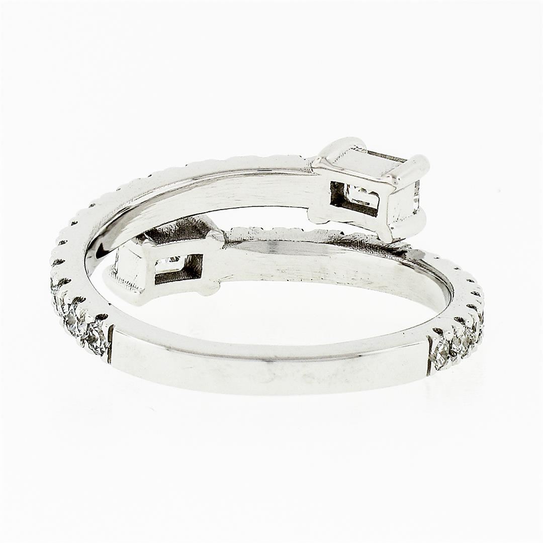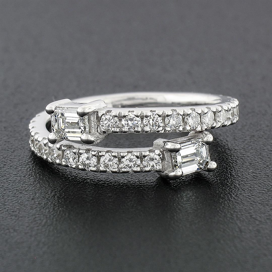 A New solid 14k white gold Moi et Toi bypass band ring, with 2 emerald cut natural diamonds (G/H - VS1 ; 0.42ctw ), and 26 round brilliant cut natural diamonds (G/H - VS1/VS2 ; 0.50ctw). The ring is size 6.0, weighs a total of 3.07 grams, and measures 7.9mm wide.