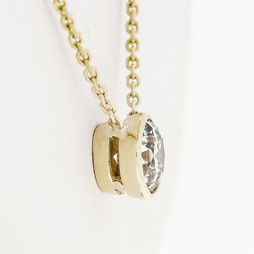 A New solid 14k yellow gold solitaire pendant necklace, with 1 round brilliant cut natural diamond (H - SI1 ; 0.65ct). 16 to 18 inch cable link chain, 2.29 grams total weight, pendant measures 6.4mm in diameter.