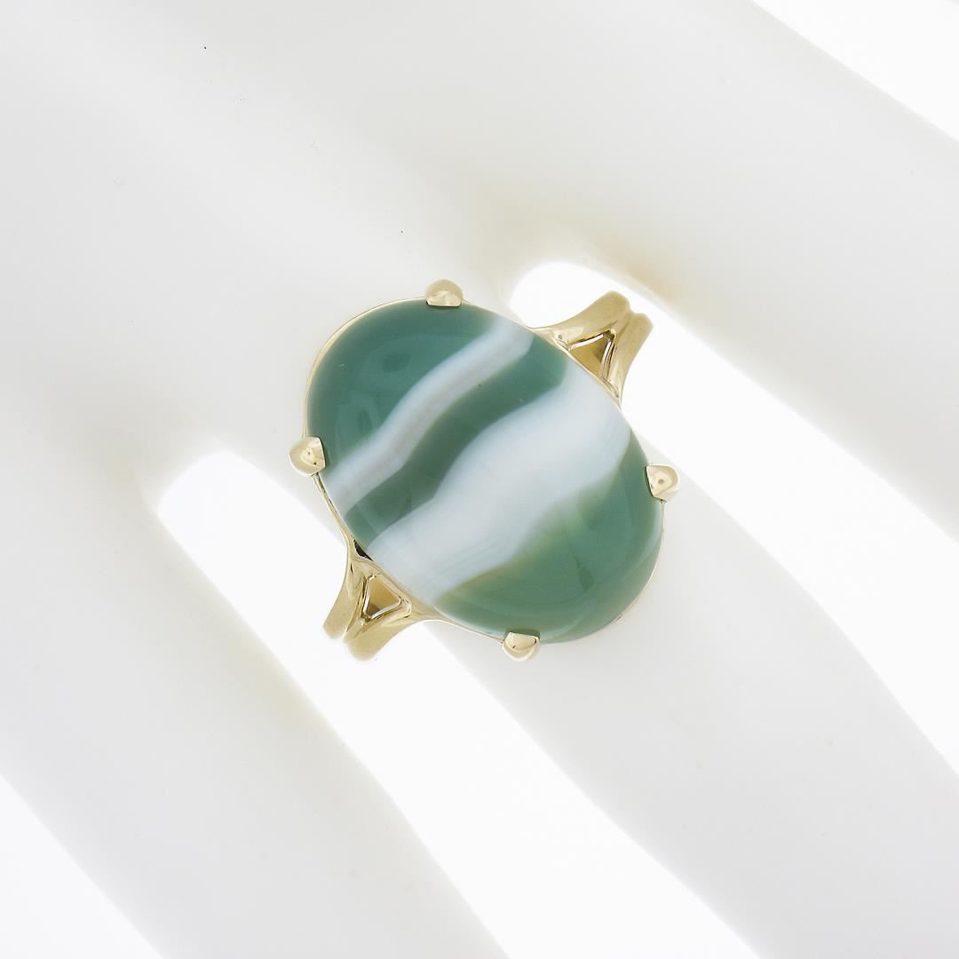 A new solid 14k yellow gold ring, with 1 oval cabochon cut natural agate (18.2x13mm). The ring is size 8.0, weighs a total of 5.33 grams, and measures 18.6mm wide.