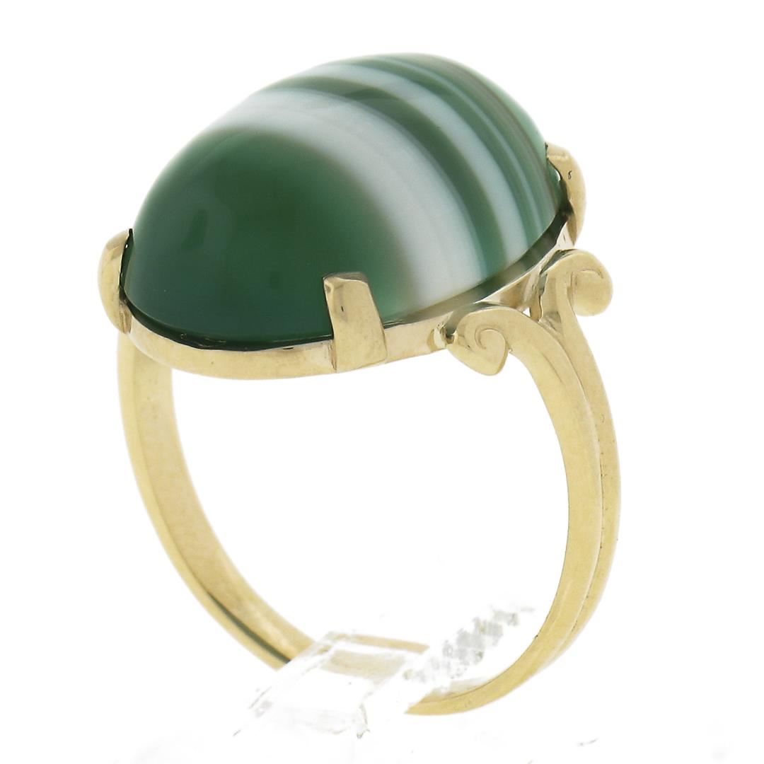 A new solid 14k yellow gold ring, with 1 oval cabochon cut natural agate (18.2x13mm). The ring is size 7.0, weighs a total of 4.75 grams, and measures 18.6mm wide.