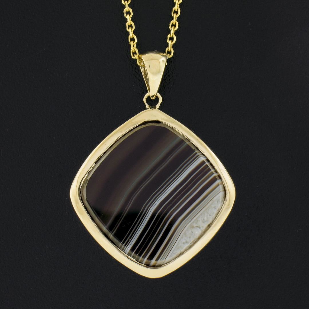 A new solid 14k yellow gold pendant nekclace, with 1 square cut natrual agate (17.7x17.6mm). adjustable 16 or 18 inch cable link chain, 5.65  grams total weight, pendant measures 28.3x20.9mm.
