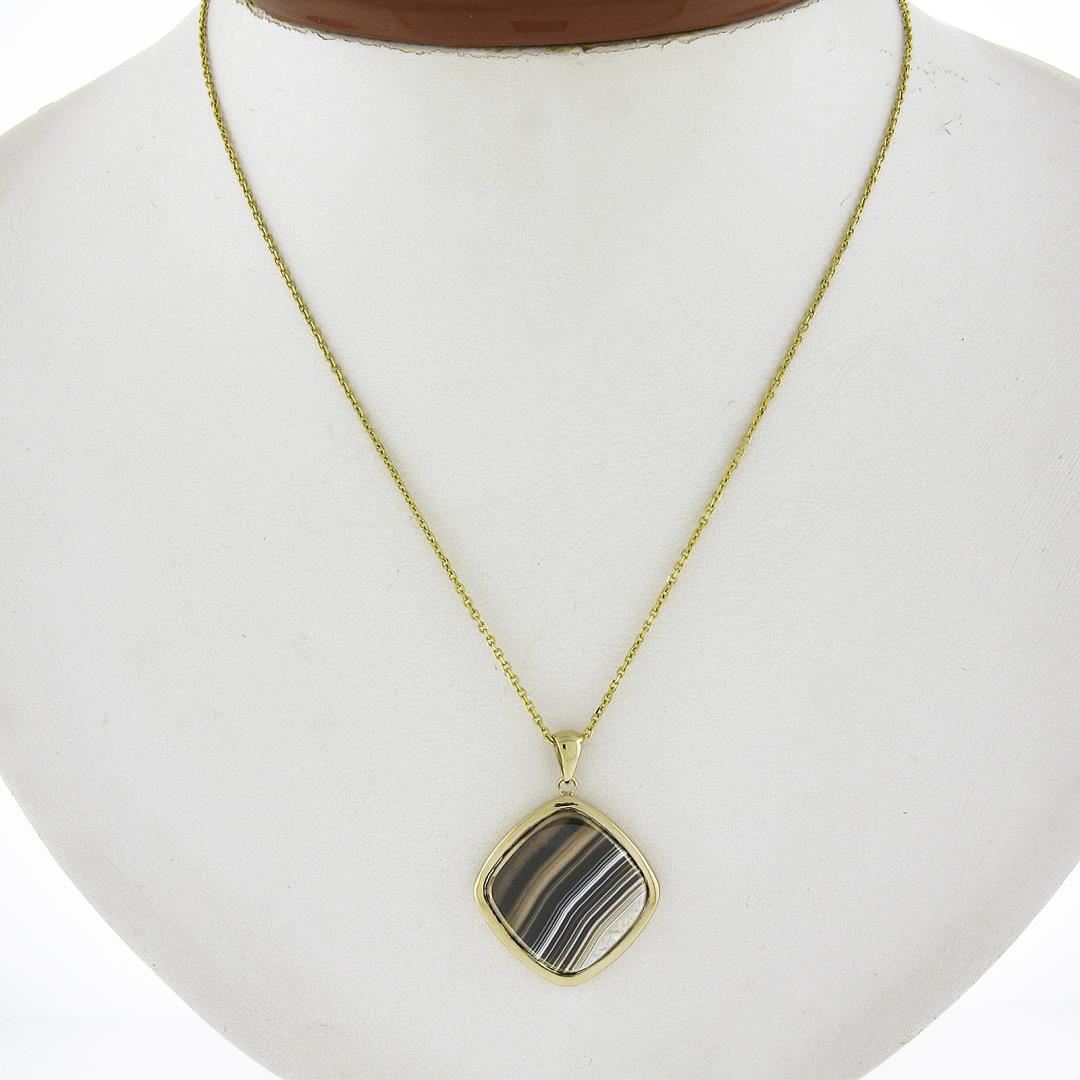 A new solid 14k yellow gold pendant nekclace, with 1 square cut natrual agate (17.7x17.6mm). adjustable 16 or 18 inch cable link chain, 5.65 grams total weight, pendant measures 28.3x20.9mm.