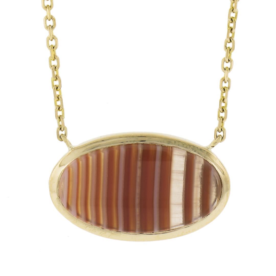A new solid 14k yellow gold pendant necklace, with 1 oval cut natural agate (17.7x9.7mm). Adjustable 16 or 18 inch cable link chain, 4.75 grams total weight, pendant measures 12.2x20mm.