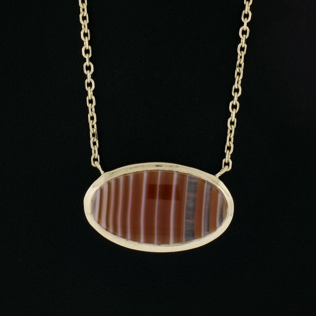 New 14k Yellow Gold Oval Orange Banded Agate Pendant Adjustable Chain Necklace