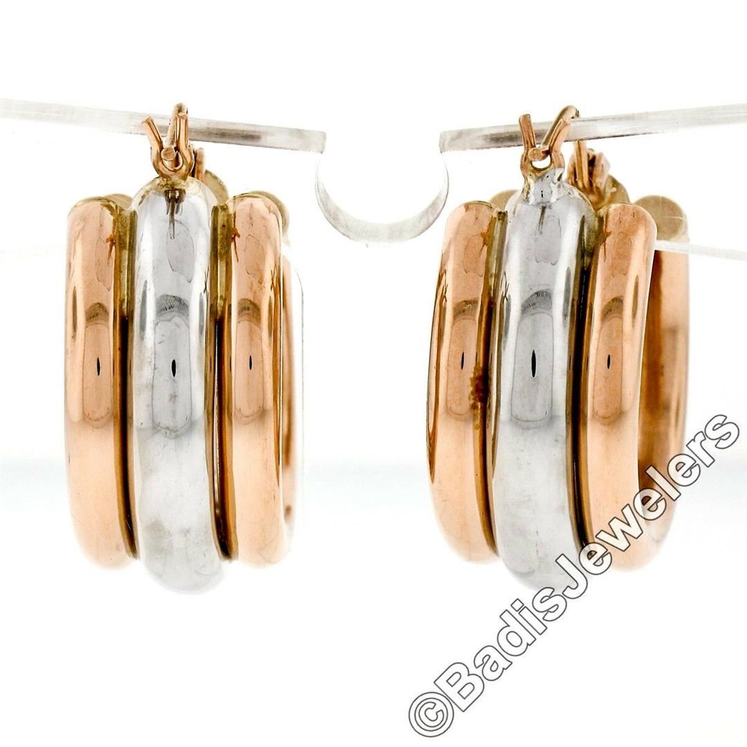 A new pair of 14kt white and rose gold hoop earrings featuring a puffed triple tube design. The earrings measure approximately 10.25mm wide, 22.65mm in diameter, and weigh a total of 6.00 grams.