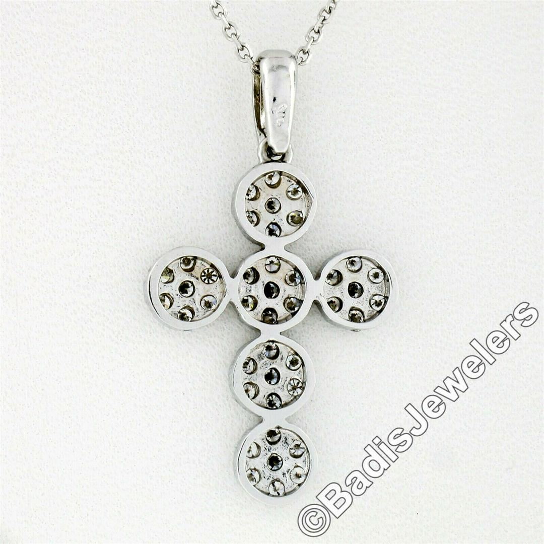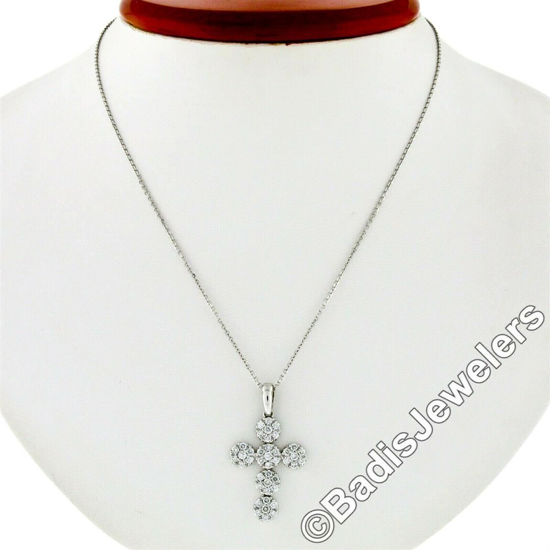 A new 14kt white gold cross pendant necklace featuring 42 round brilliant diamonds (E/F - VVS1/VVS2 ;0.85ctw) set in 6 round clusters. 18 inch cable link chain, 4.48 grams total weight, pendant measures 30.7x17.0mm.